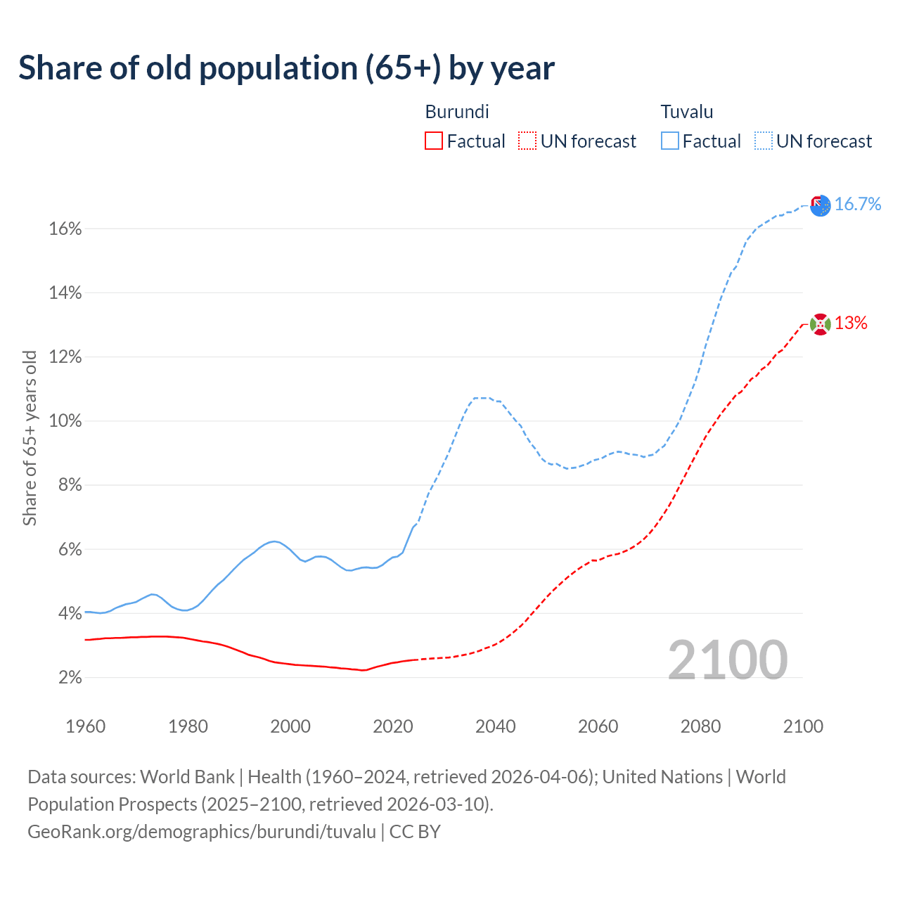 - The share of old-age demographic (65+) in Burundi is 2.53% vs 6.67% in Tuvalu.