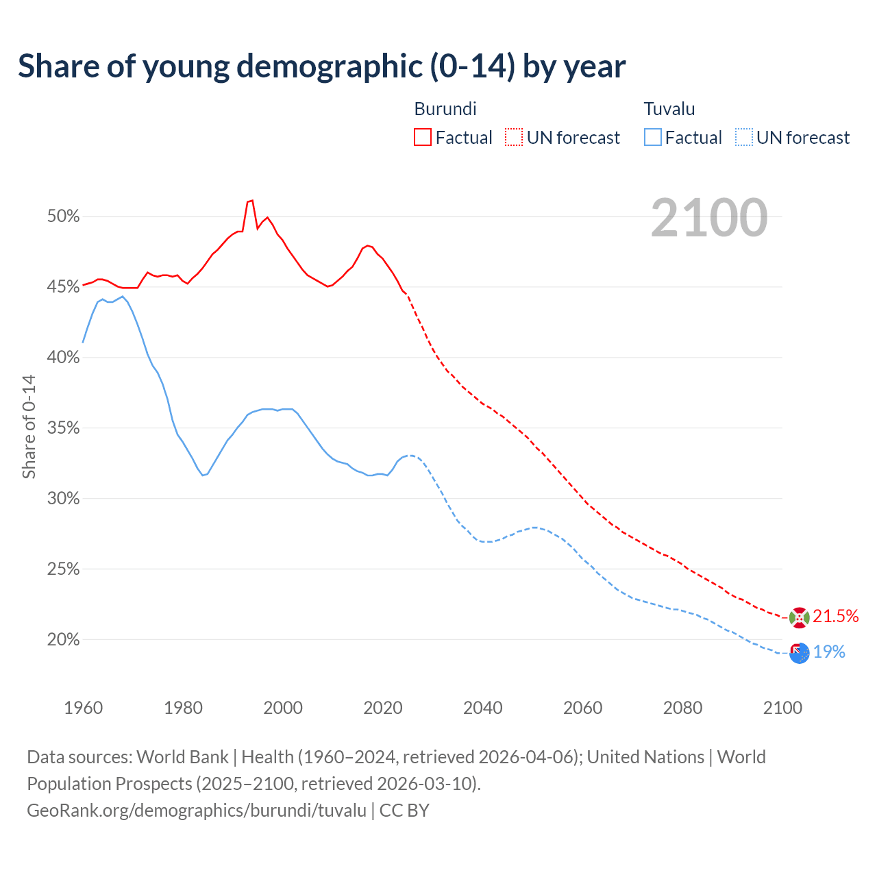 - The share of young demographic (0-15 years old) in Burundi is 44.7% vs 32.9% in Tuvalu.
