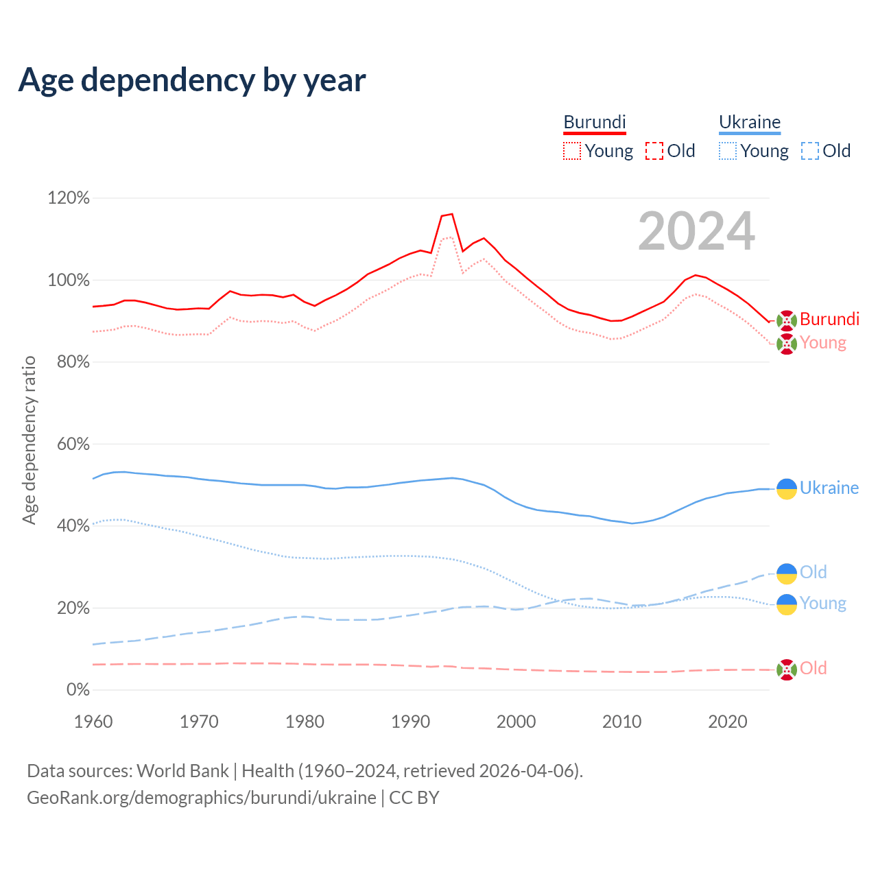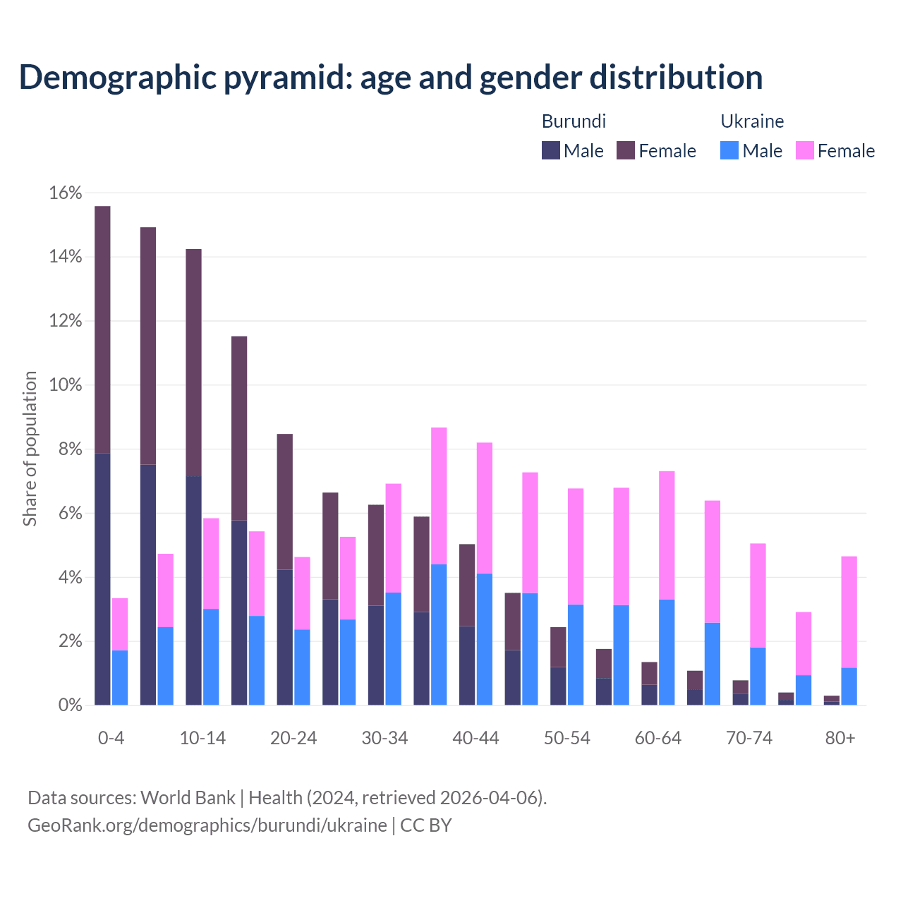 - Burundi is ranked 190/196 by median age (oldest to youngest) vs 26/196 for Ukraine.