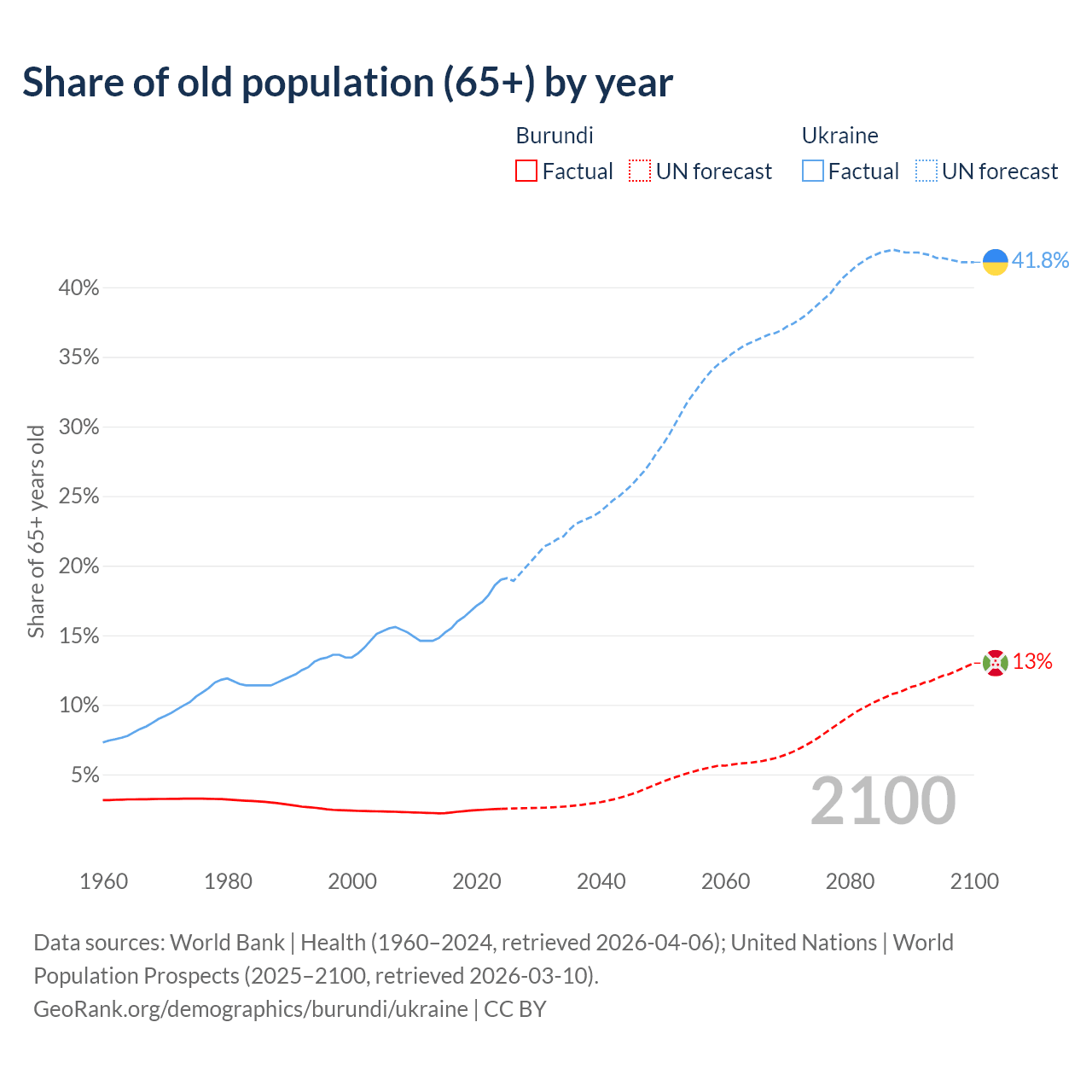 The share of older people aged 65 and over is 2.53% in Burundi and 19% in Ukraine. Life expectancy in Burundi compared to Ukraine .