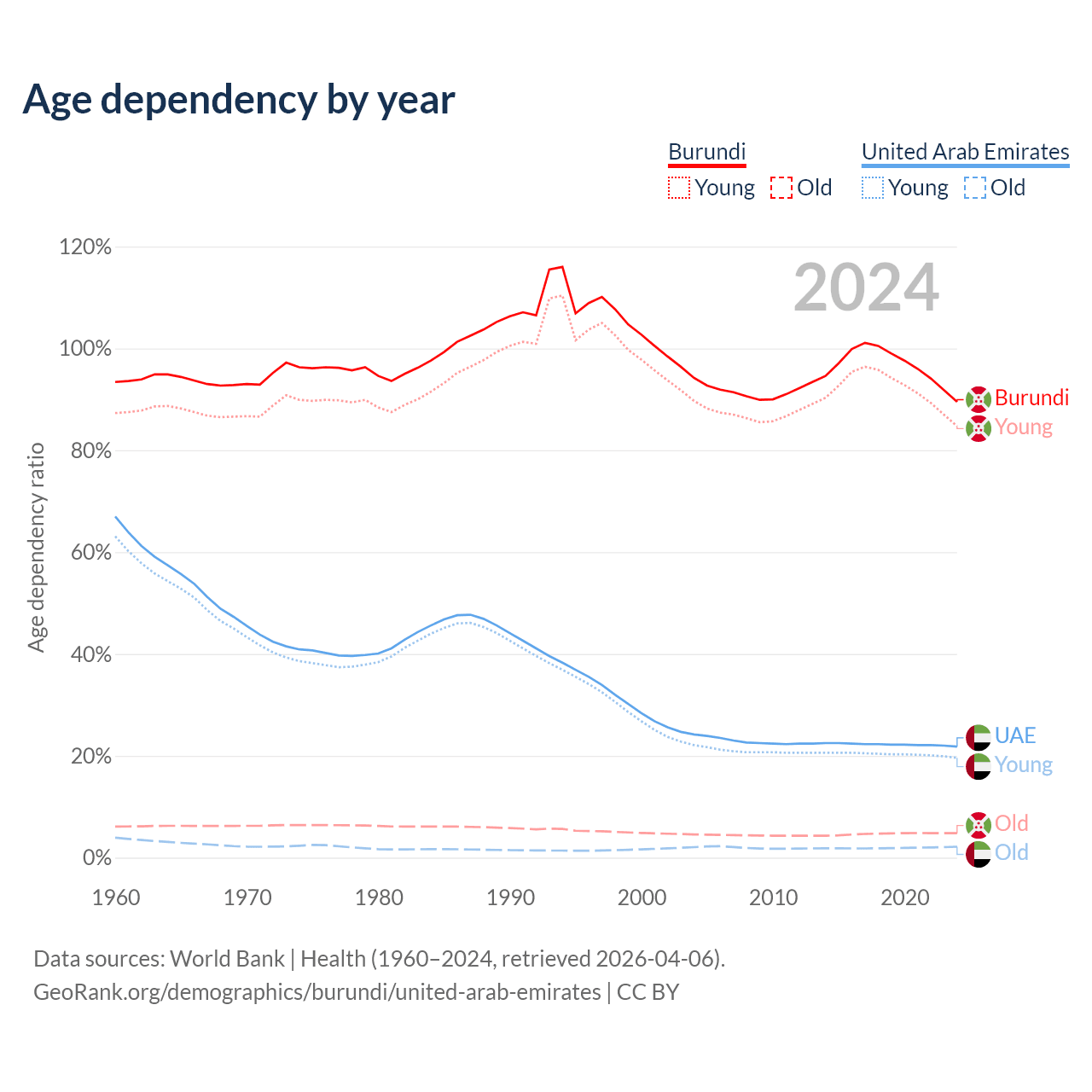 - Burundi is ranked 190/196 by median age (oldest to youngest) vs 91/196 for the United Arab Emirates.