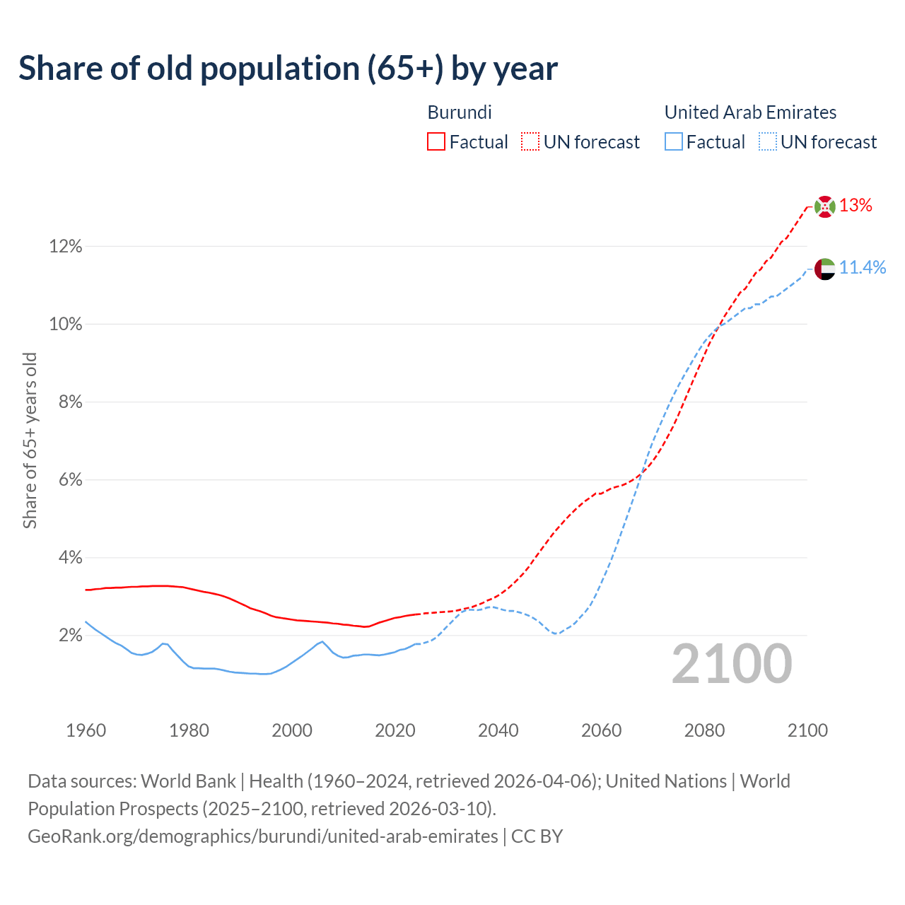 - The share of old-age demographic (65+) in Burundi is 2.53% vs 1.77% in the United Arab Emirates.