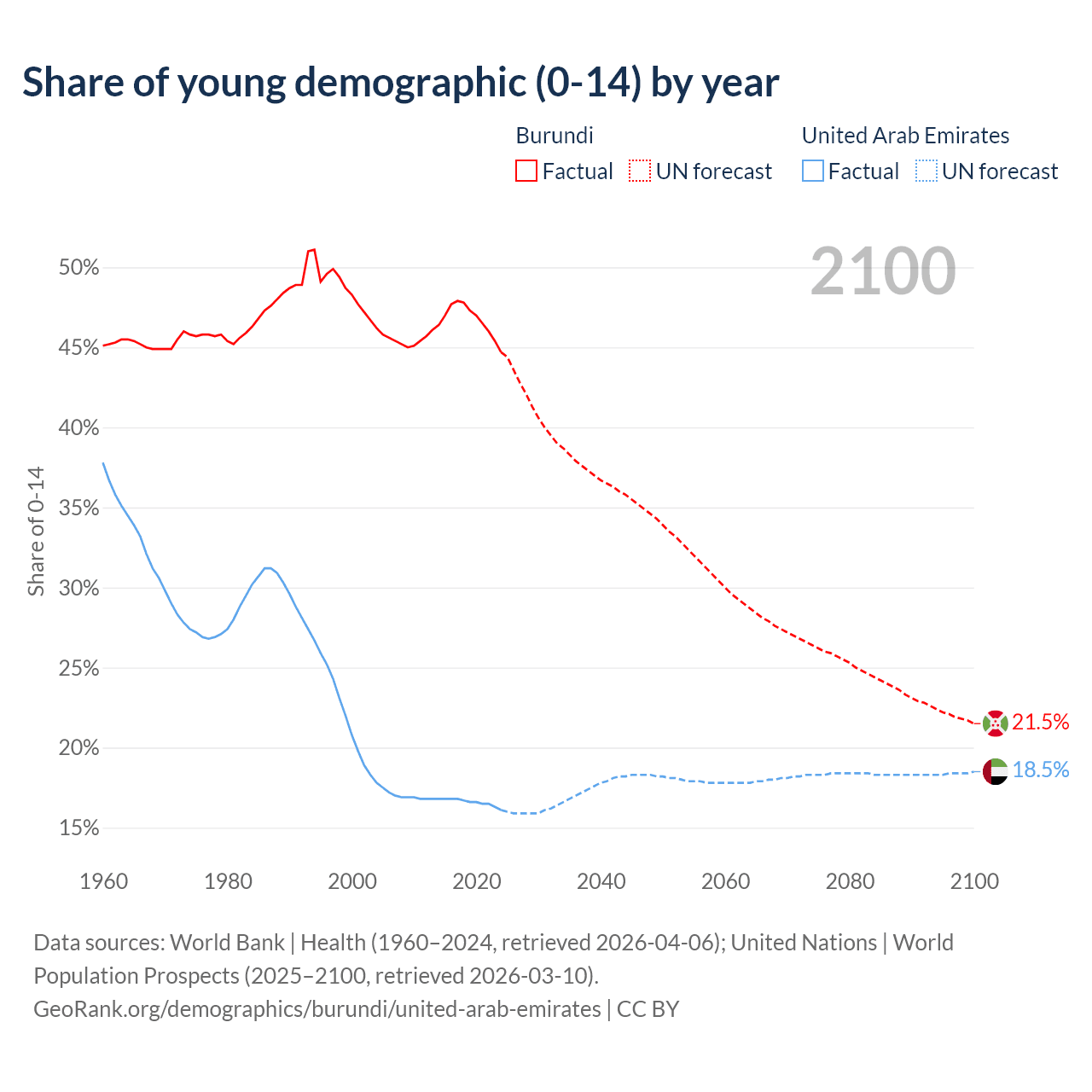 - The share of young demographic (0-15 years old) in Burundi is 44.7% vs 16.1% in the United Arab Emirates.