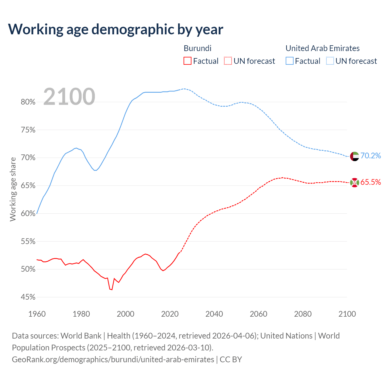Median age Burundi vs United Arab Emirates, 1960-2100