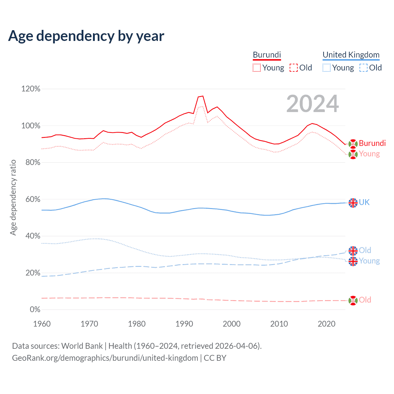 - Burundi is ranked 190/196 by median age (oldest to youngest) vs 41/196 for the United Kingdom.
