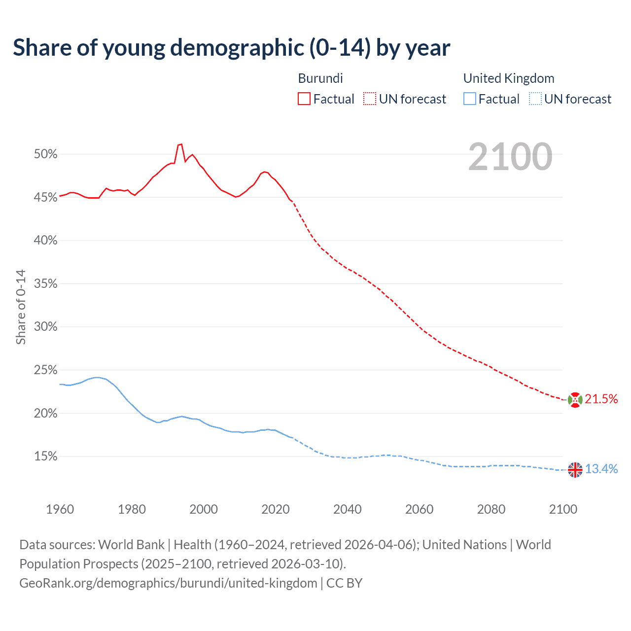 - The share of young demographic (0-15 years old) in Burundi is 44.7% vs 17.2% in the United Kingdom.
