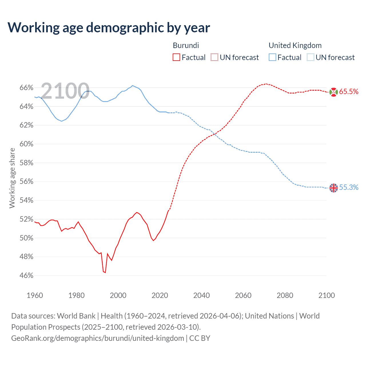 - Burundi has 7.83M working age adults (aged 15-64) vs 44.4M in the United Kingdom.