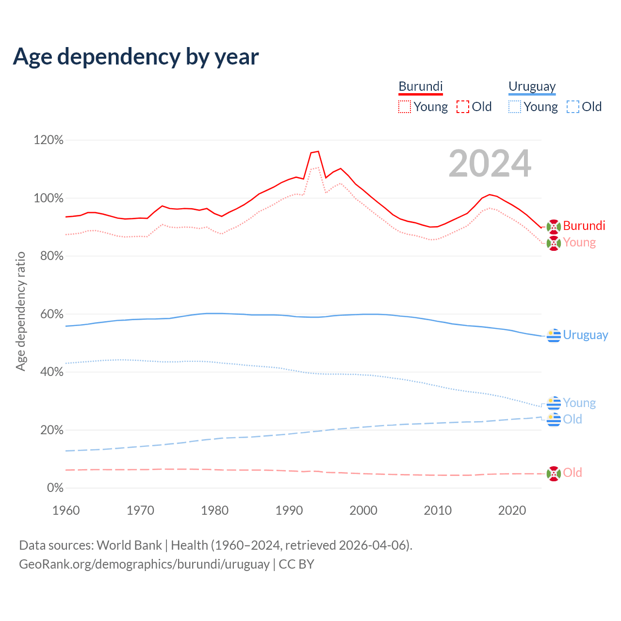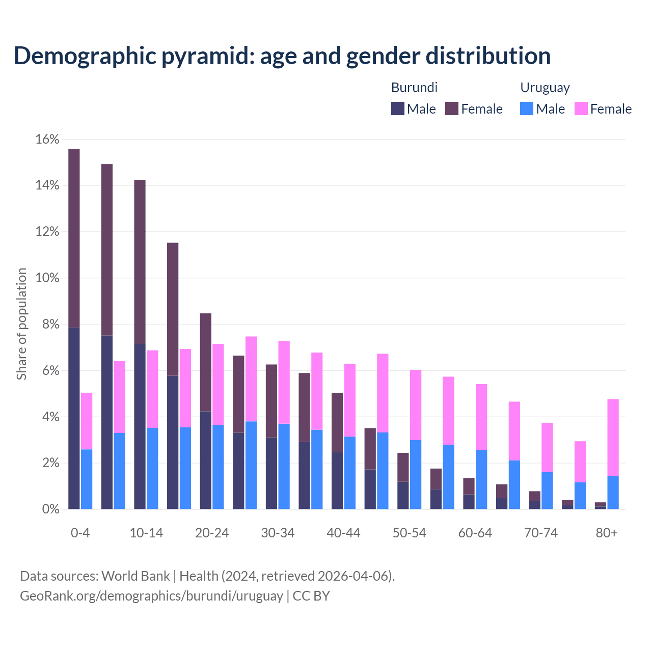 - Burundi is ranked 190/196 by median age (oldest to youngest) vs 63/196 for Uruguay.