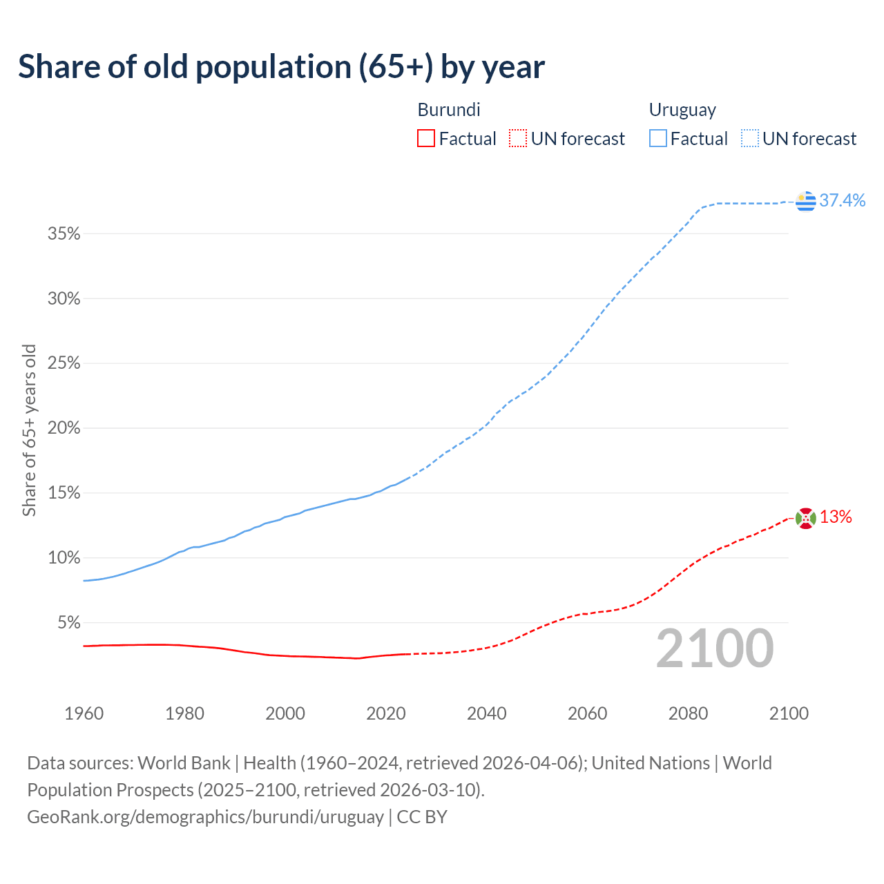The share of older people aged 65 and over is 2.53% in Burundi and 16% in Uruguay. Life expectancy in Burundi compared to Uruguay .