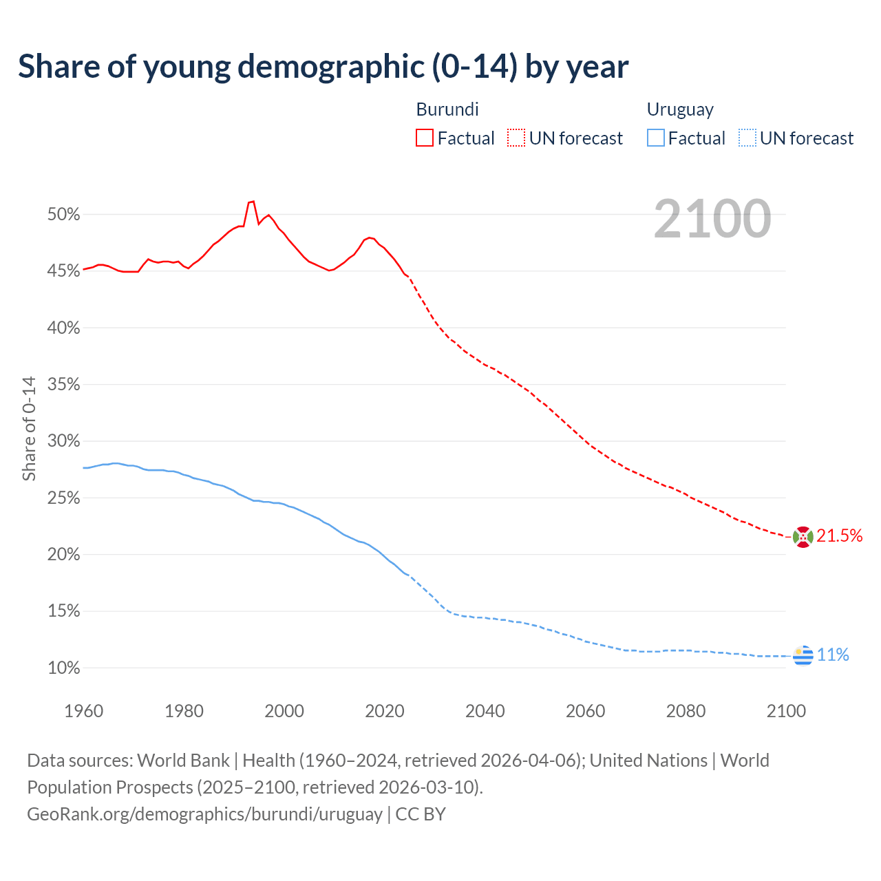 - The share of young demographic (0-15 years old) in Burundi is 44.7% vs 18.3% in Uruguay.