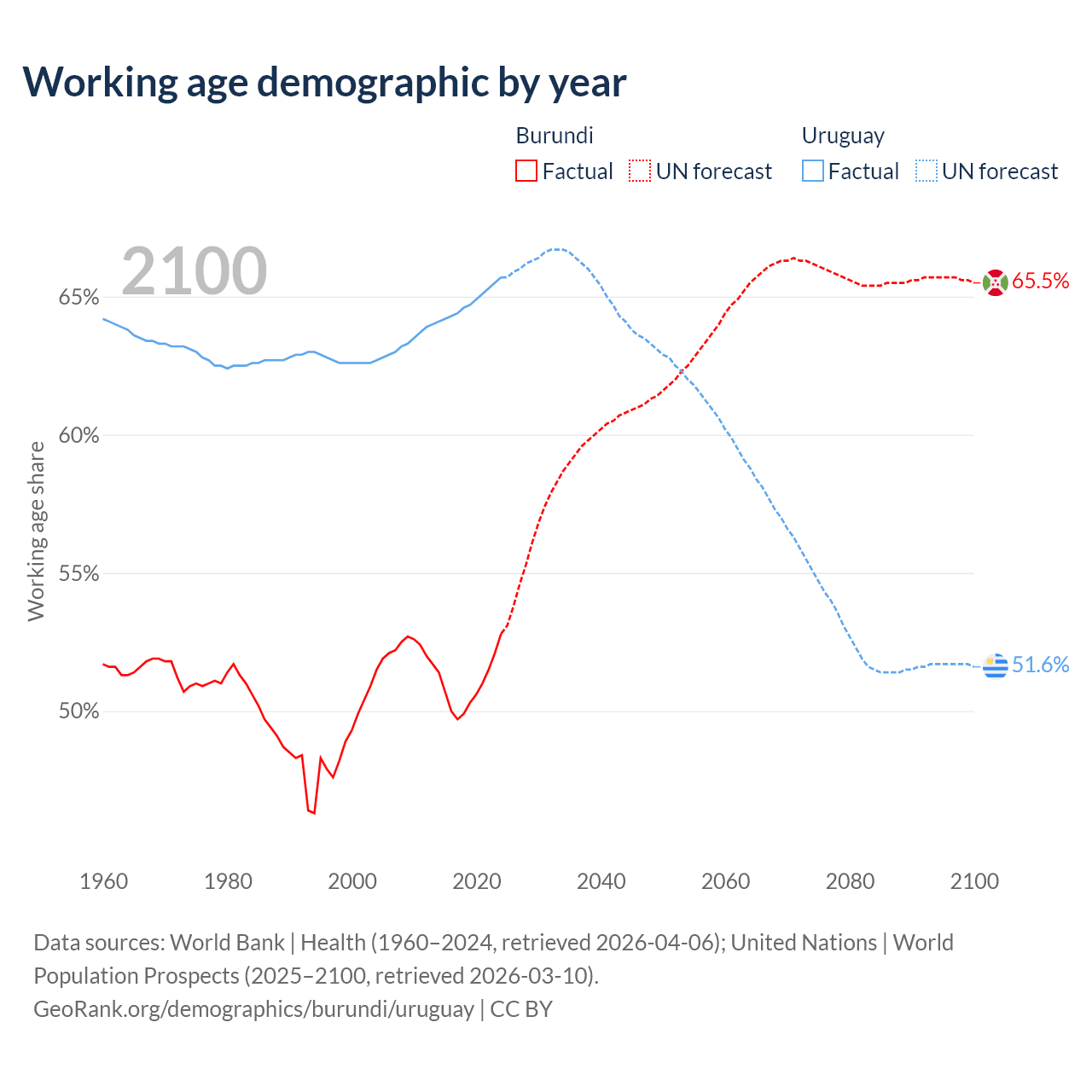 - Burundi has 7.83M working age adults (aged 15-64) vs 2.22M in Uruguay.