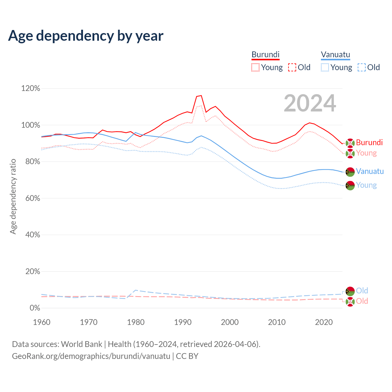 - Burundi is ranked 190/196 by median age (oldest to youngest) vs 156/196 for Vanuatu.