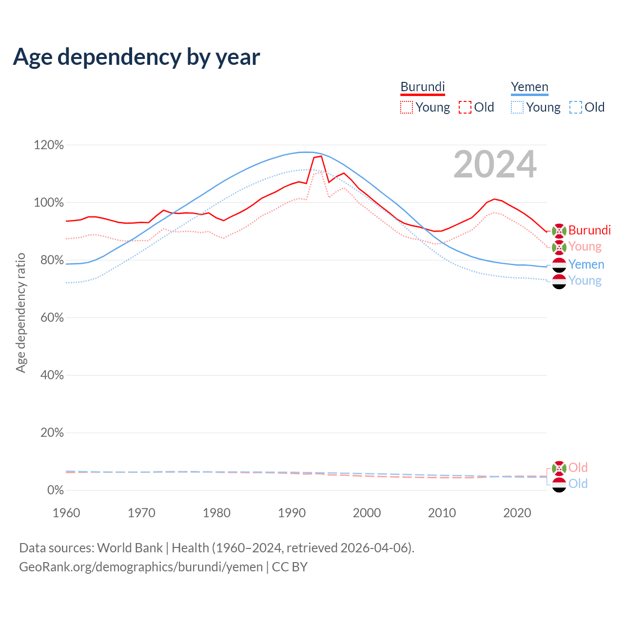 - Burundi is ranked 190/196 by median age (oldest to youngest) vs 174/196 for Yemen.