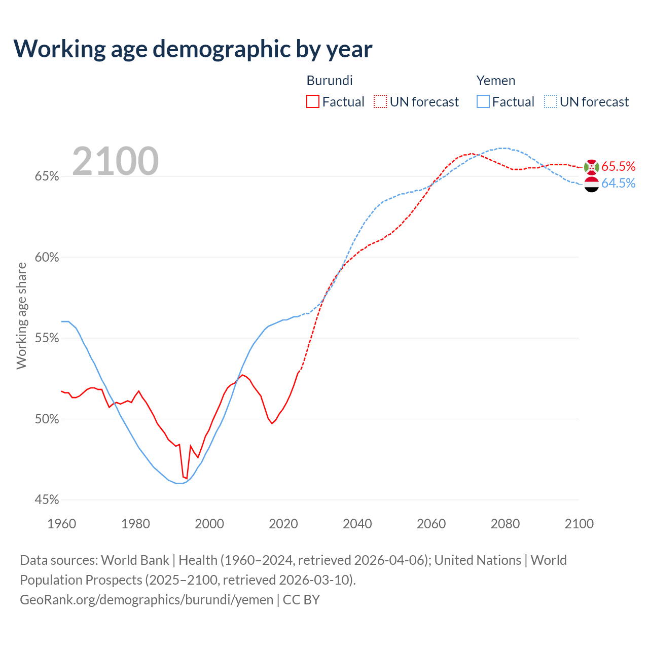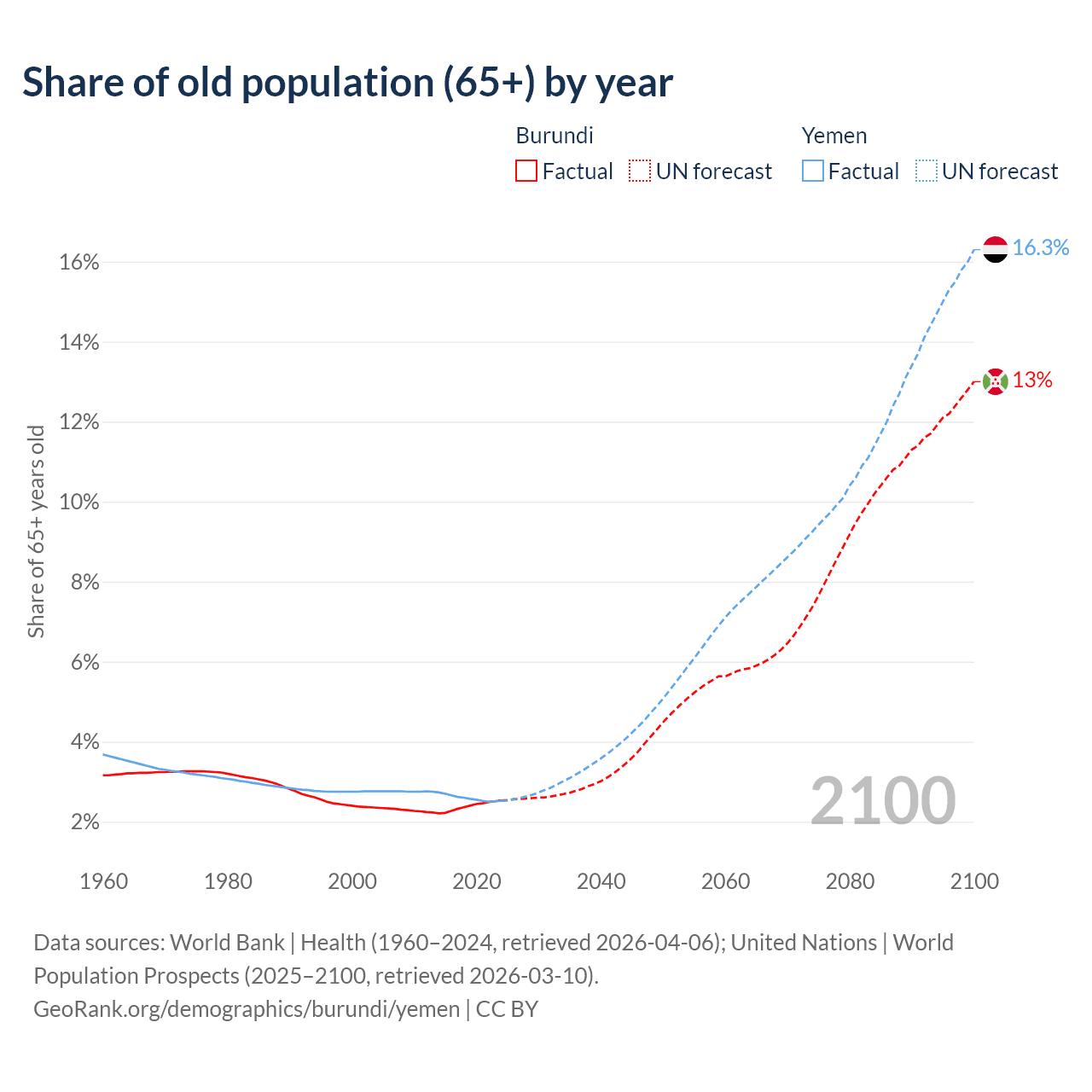 - The share of old-age demographic (65+) in Burundi is 2.53% vs 2.52% in Yemen.