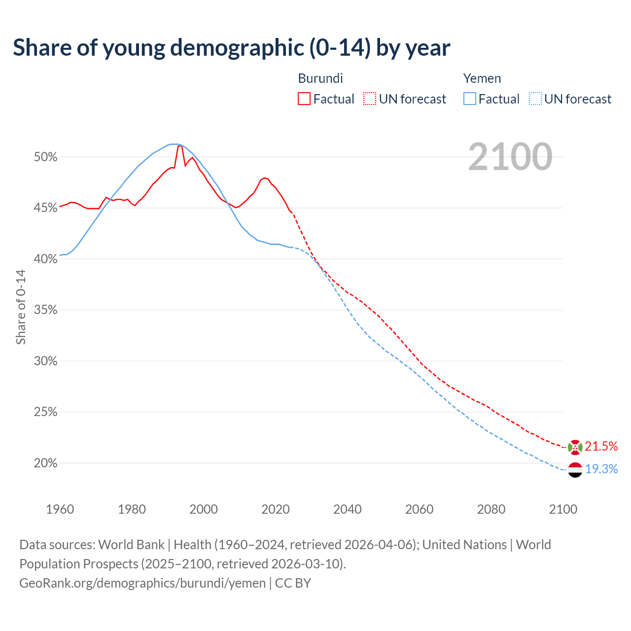 - The share of young demographic (0-15 years old) in Burundi is 44.7% vs 41.1% in Yemen.