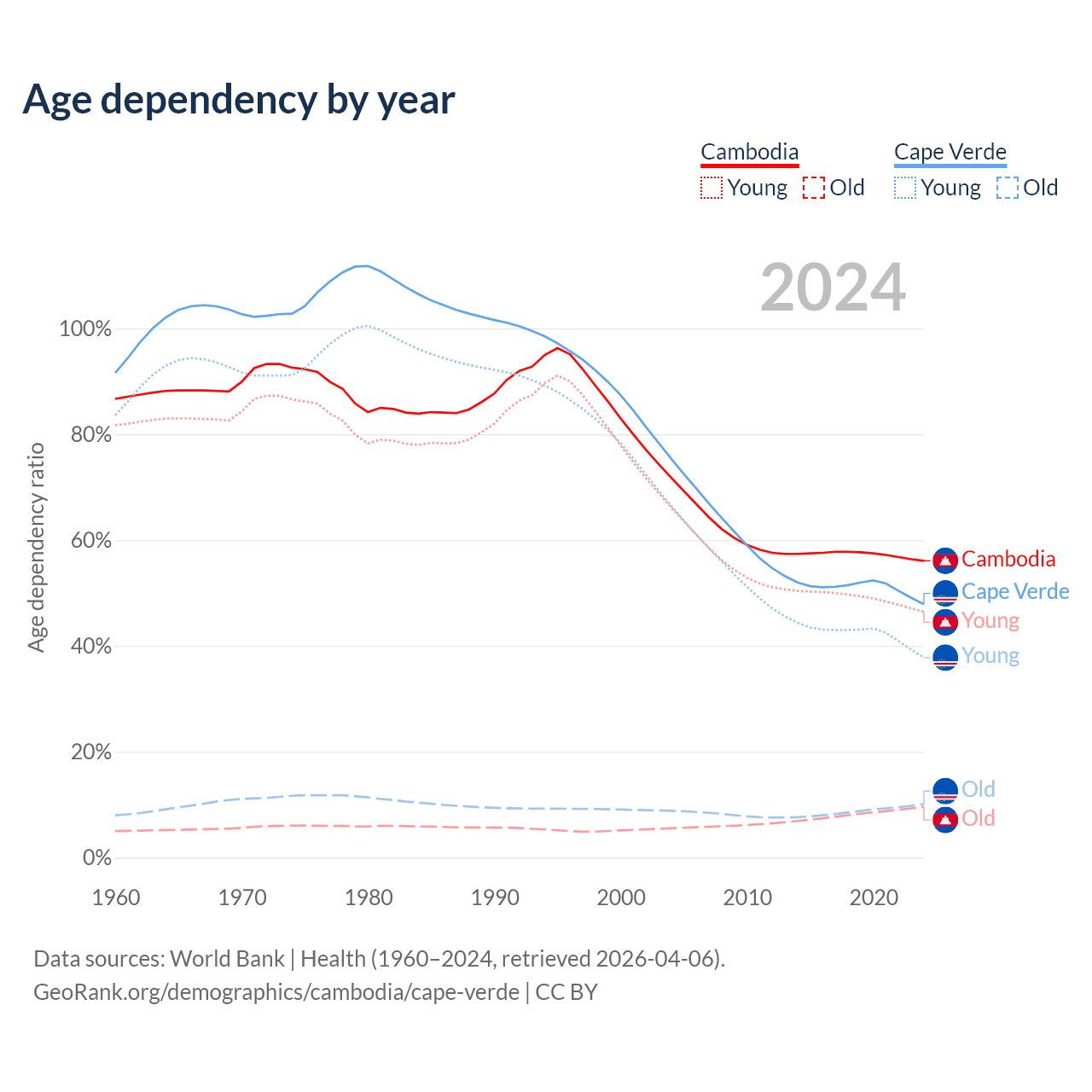 - The share of old-age demographic (65+) in Cambodia is 6.16% vs 6.86% in Cape Verde.