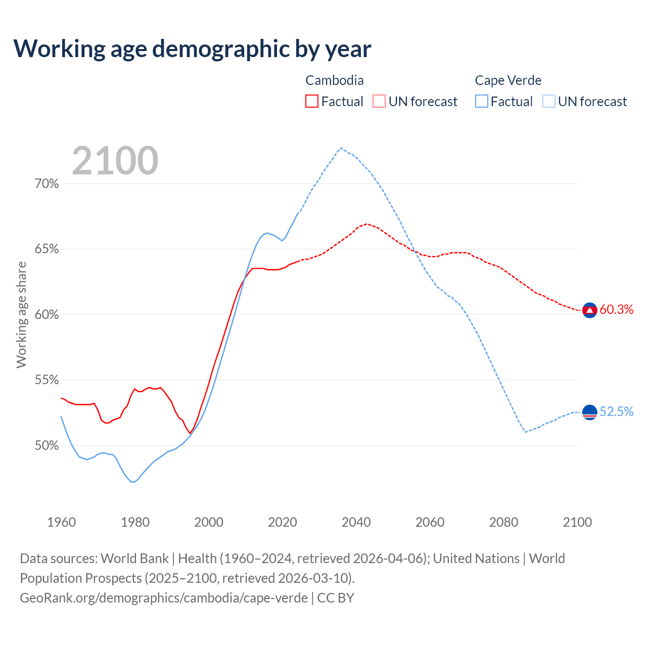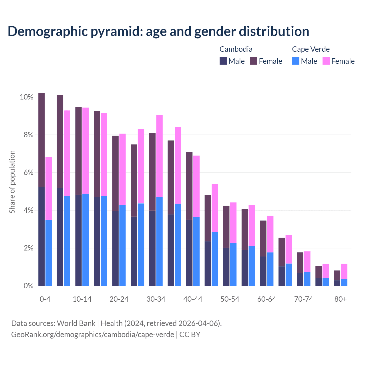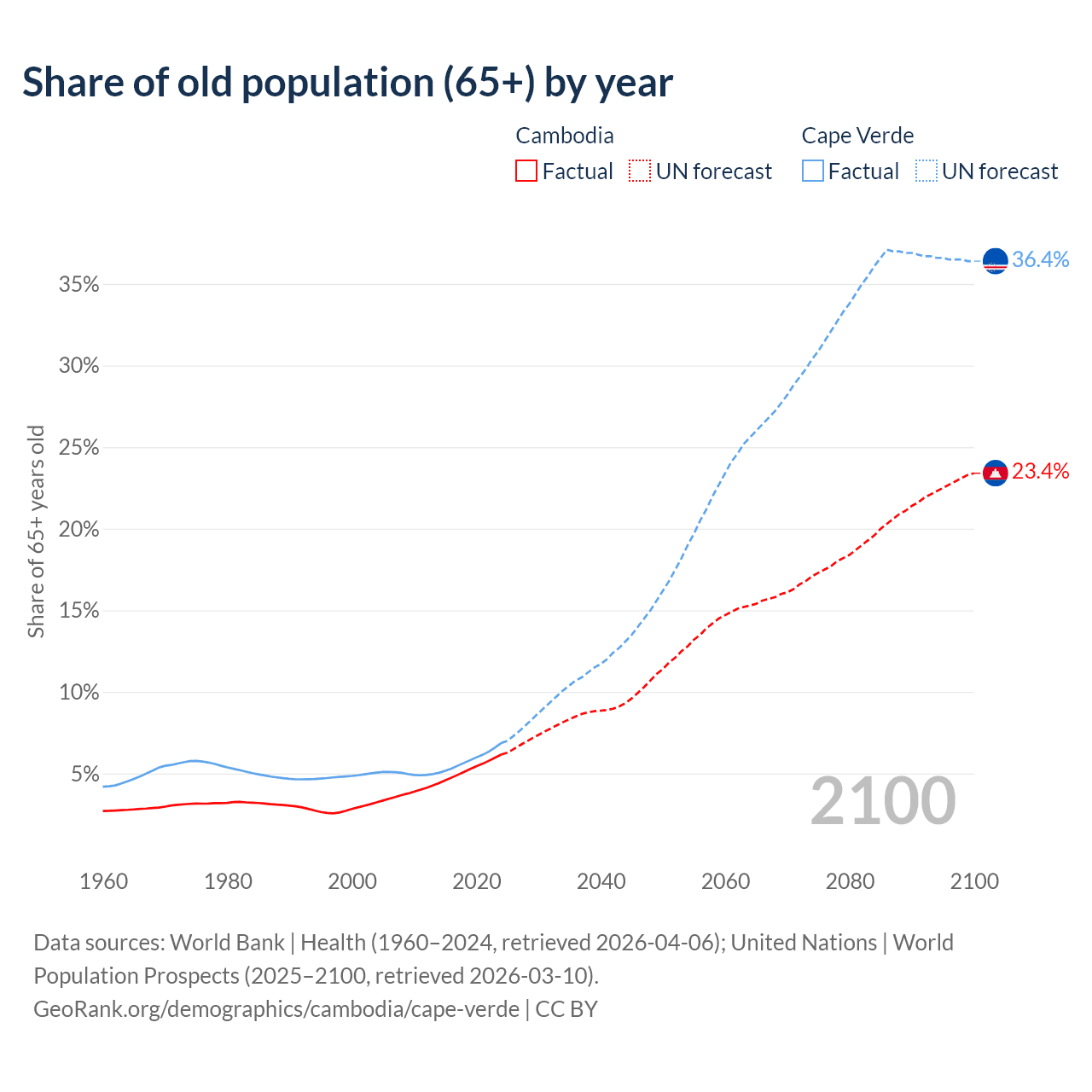 The share of older people aged 65 and over is 6.16% in Cambodia and 6.86% in Cape Verde. Life expectancy in Cambodia compared to Cape Verde .