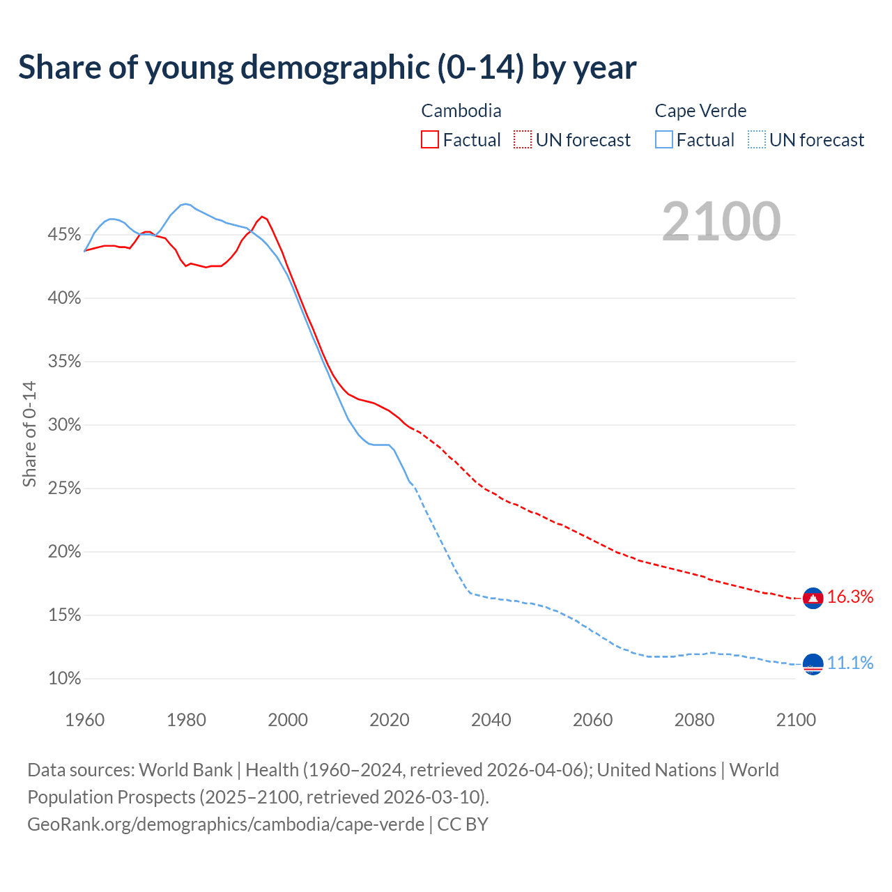 - The share of young demographic (0-15 years old) in Cambodia is 29.8% vs 25.5% in Cape Verde.