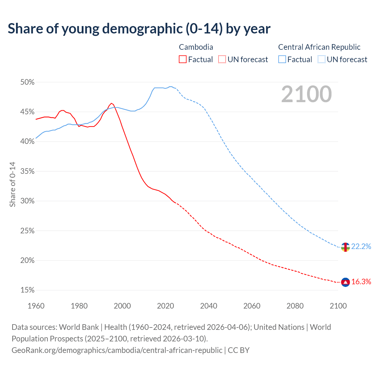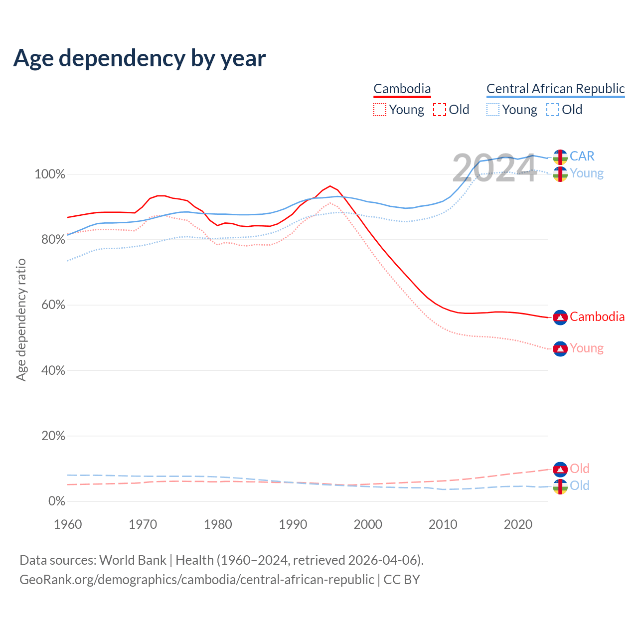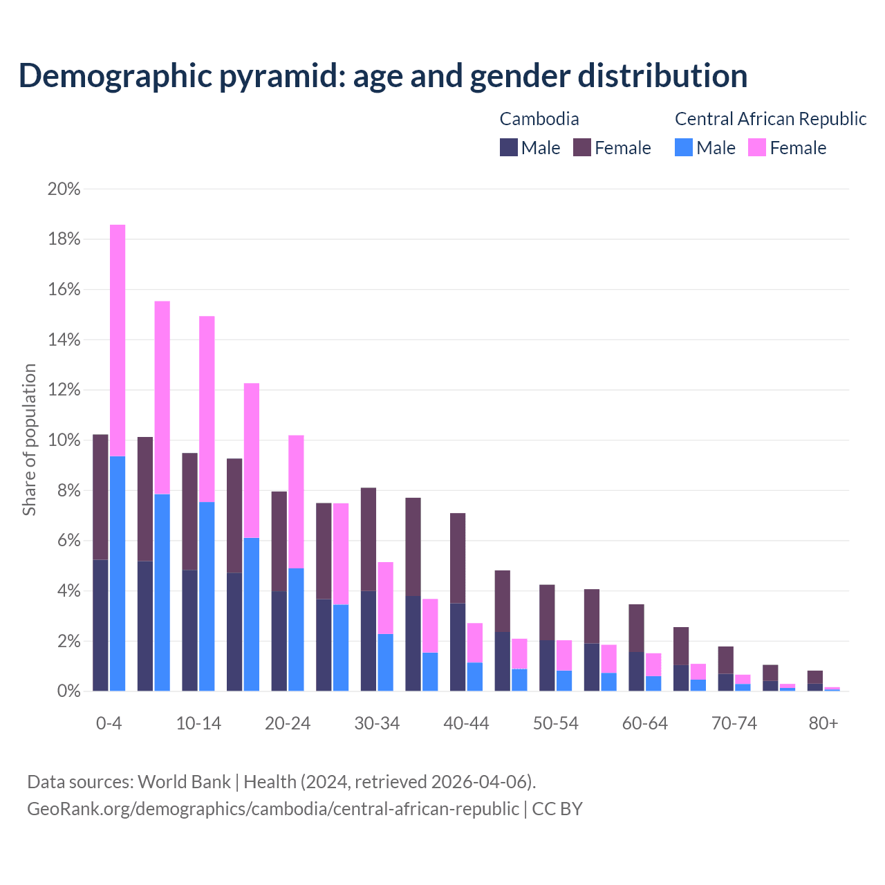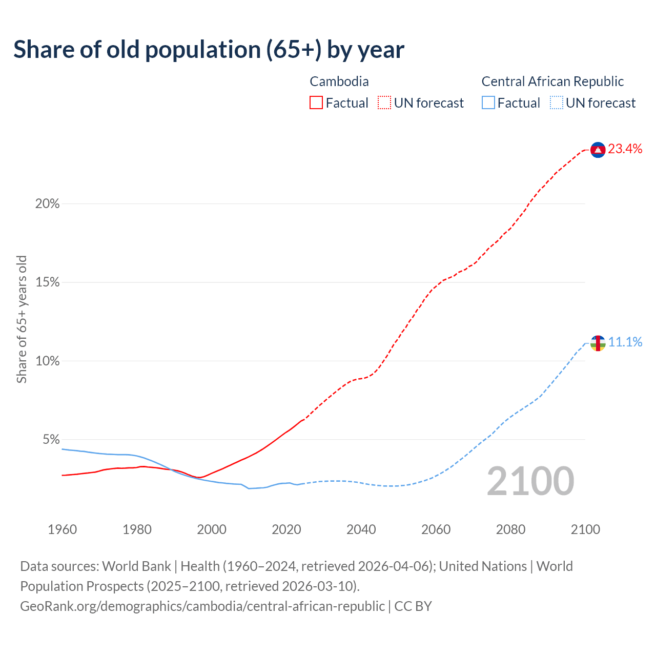 The share of older people aged 65 and over is 6.16% in Cambodia and 2.15% in the Central African Republic. Life expectancy in Cambodia compared to the Central African Republic .