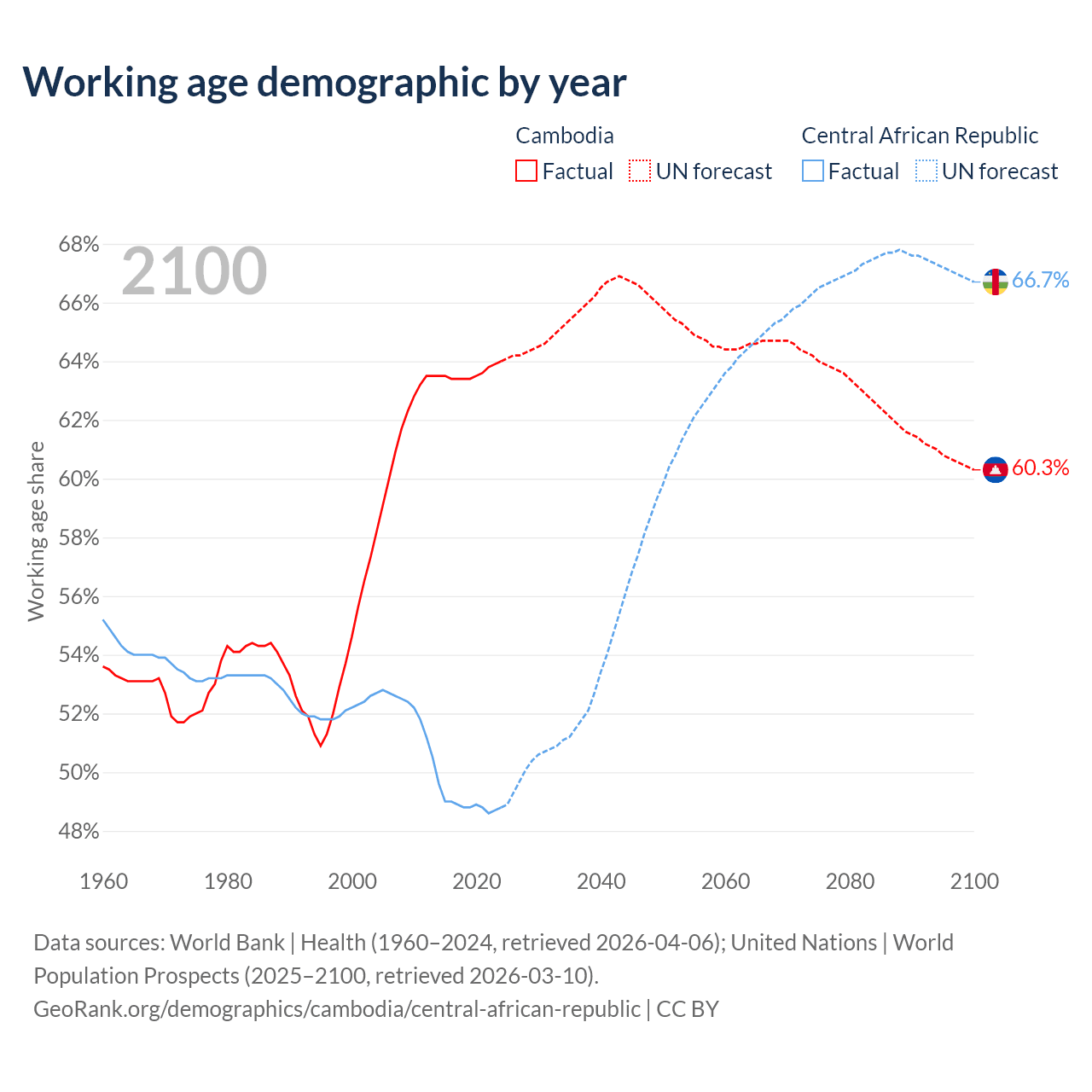 - Cambodia has 11.6M working age adults (aged 15-64) vs 2.81M in the Central African Republic.