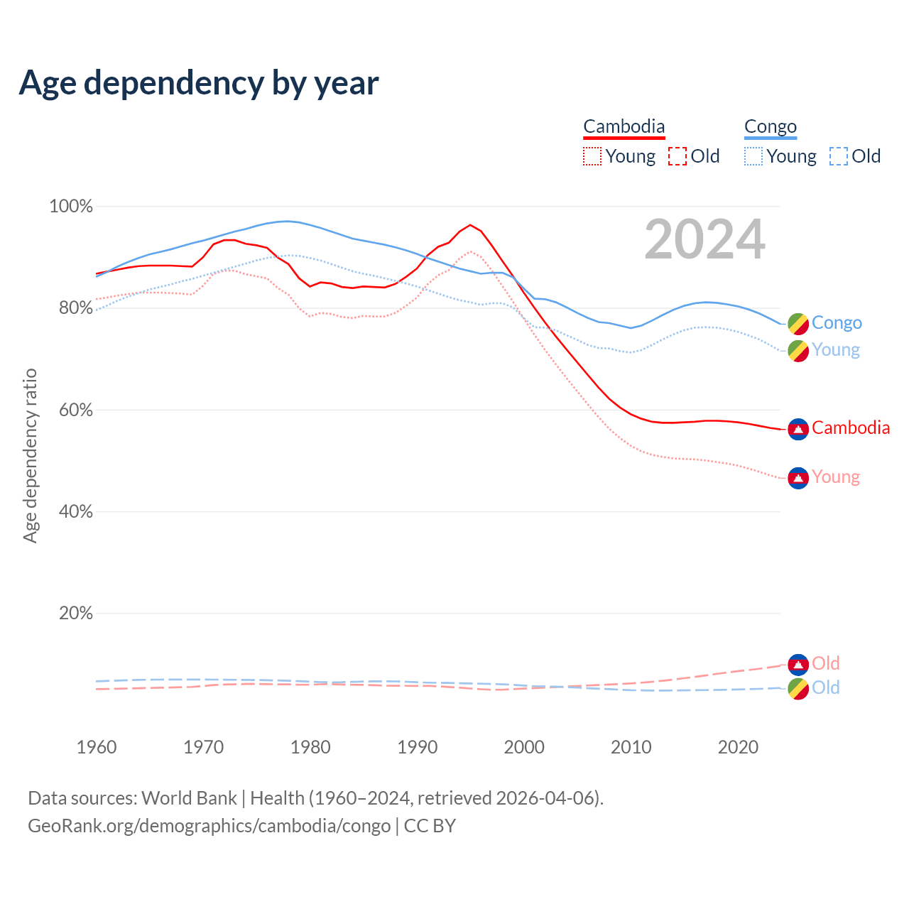 - The share of old-age demographic (65+) in Cambodia is 6.16% vs 2.99% in the Congo.