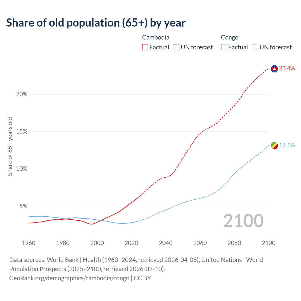 The share of older people aged 65 and over is 6.16% in Cambodia and 2.99% in the Congo. Life expectancy in Cambodia compared to the Congo .