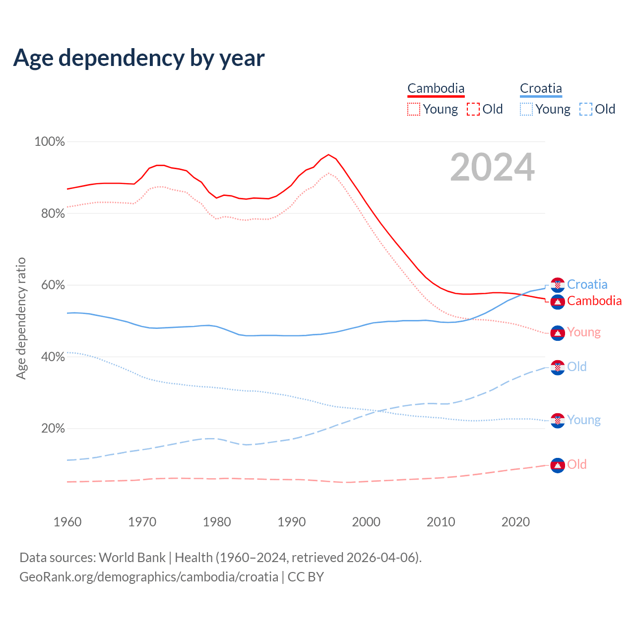 - Cambodia is ranked 121/196 by median age (oldest to youngest) vs 11/196 for Croatia.