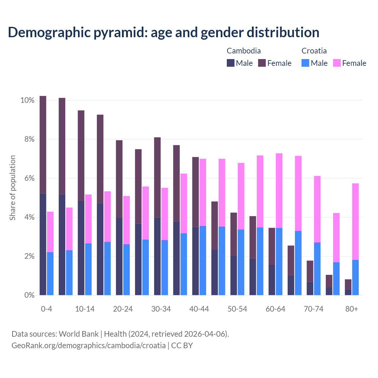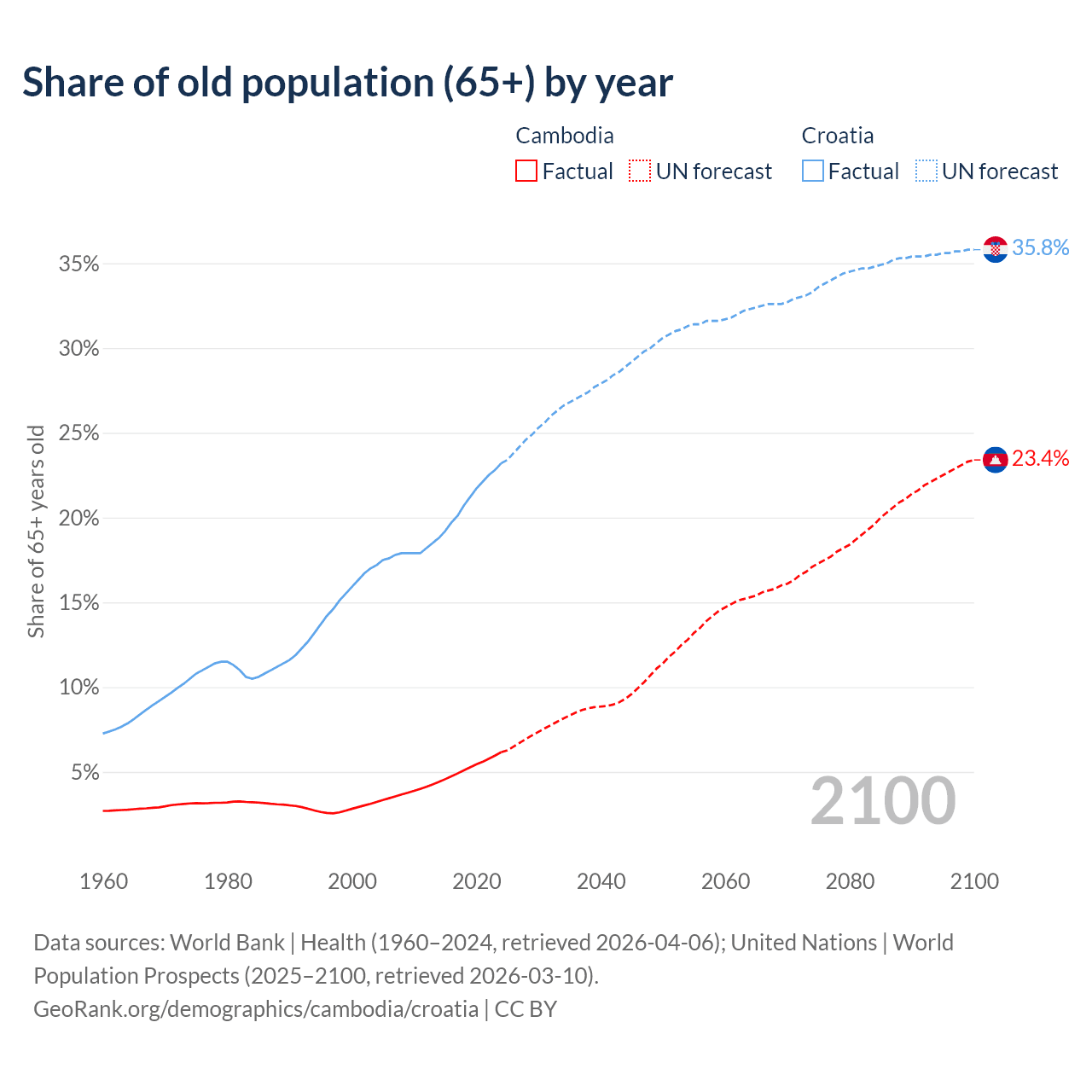 The share of older people aged 65 and over is 6.16% in Cambodia and 23.2% in Croatia. Life expectancy in Cambodia compared to Croatia .