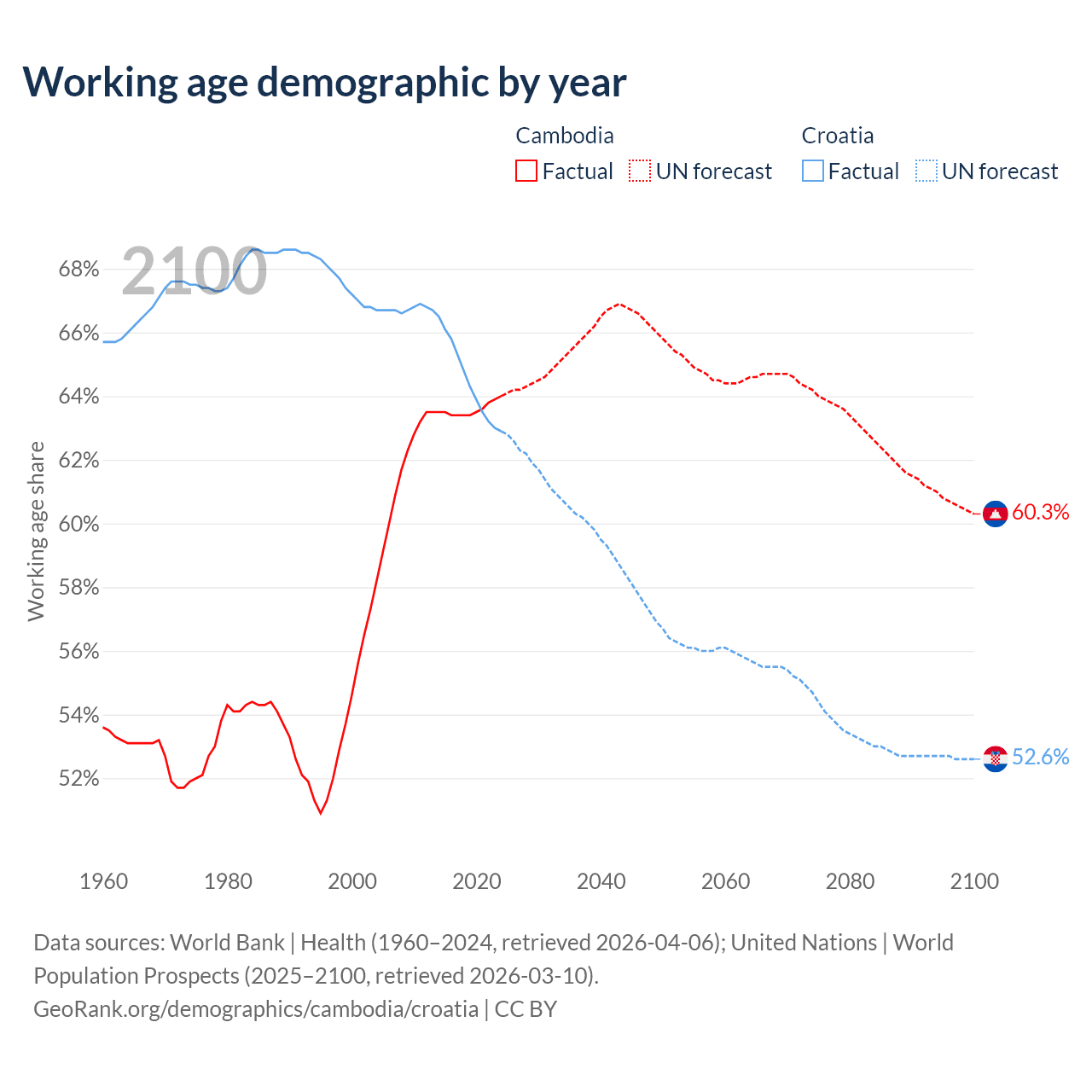 Median age Cambodia vs Croatia, 1960-2100