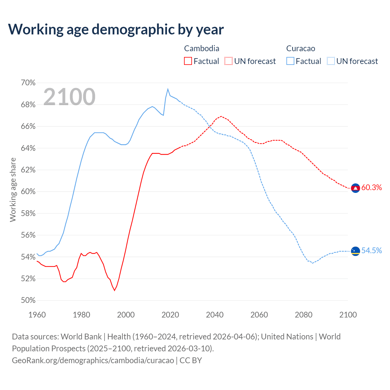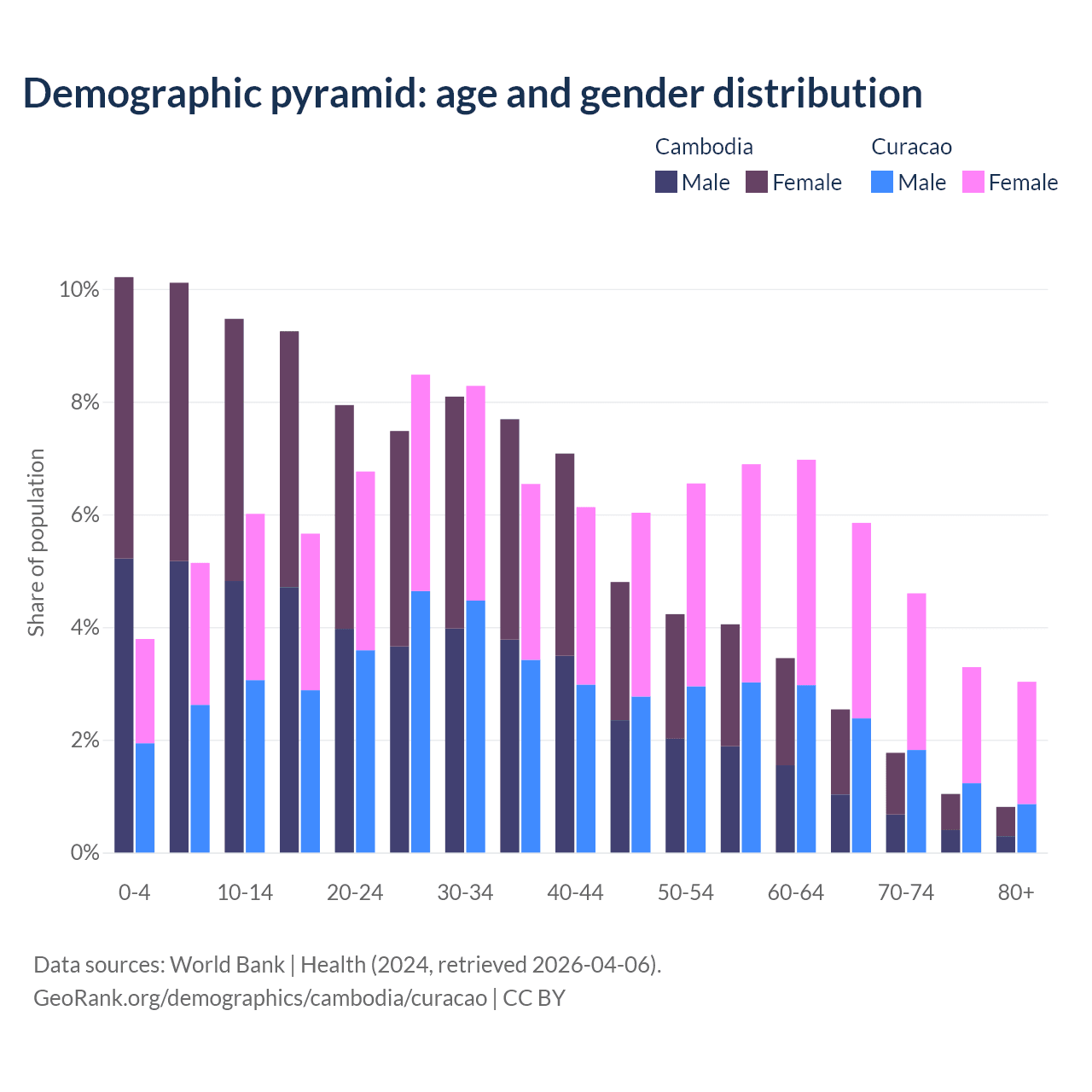- The share of old-age demographic (65+) in Cambodia is 6.16% vs 16.8% in Curacao.