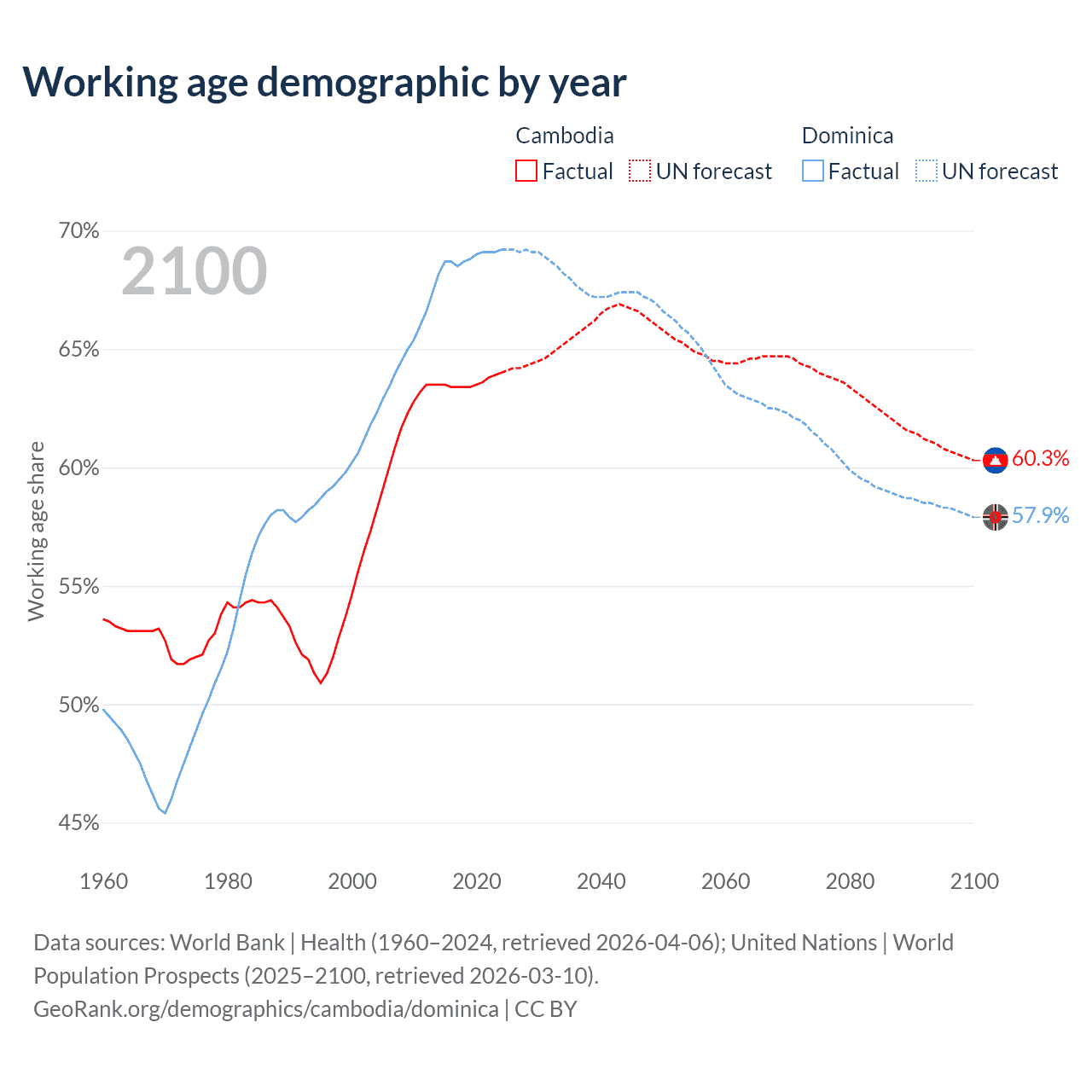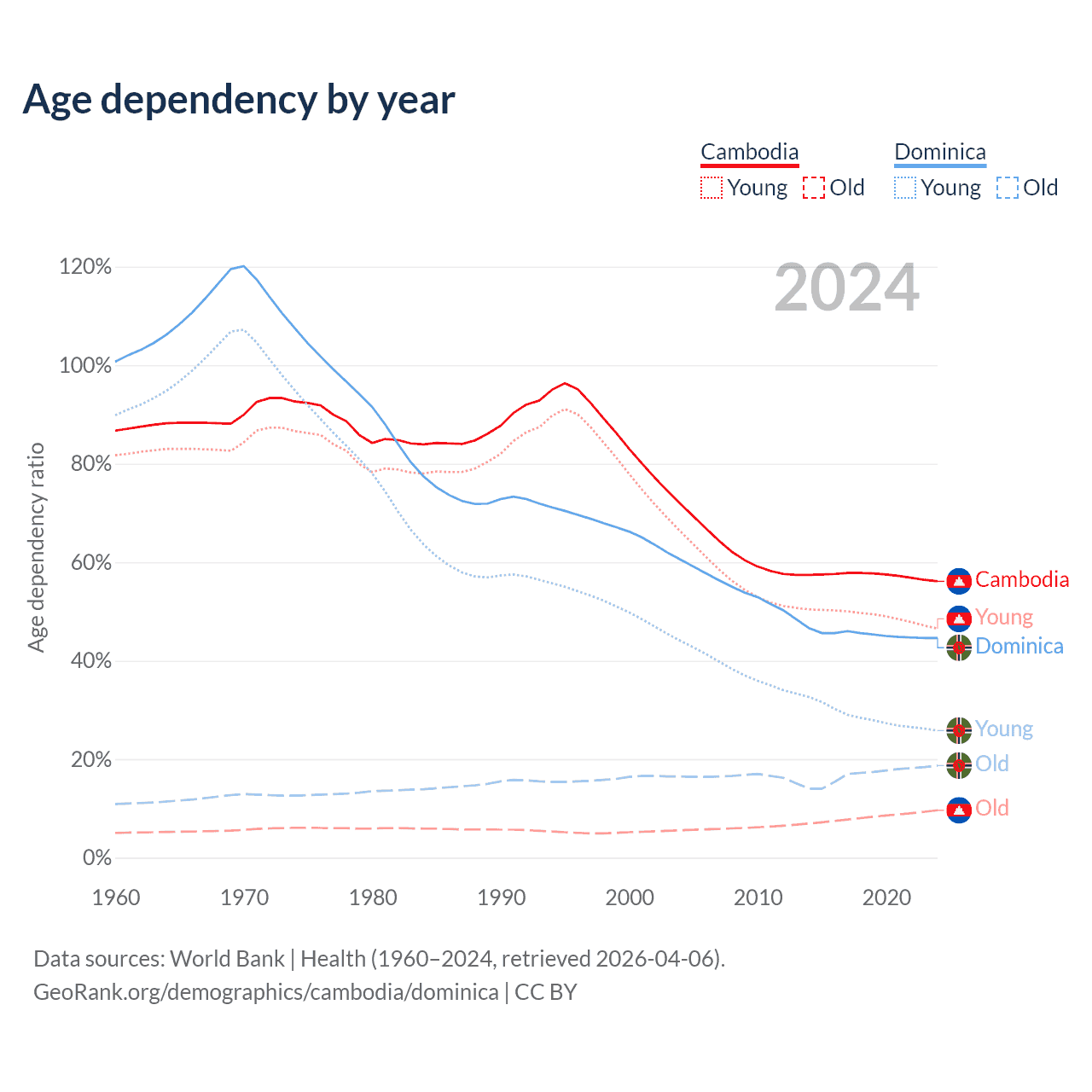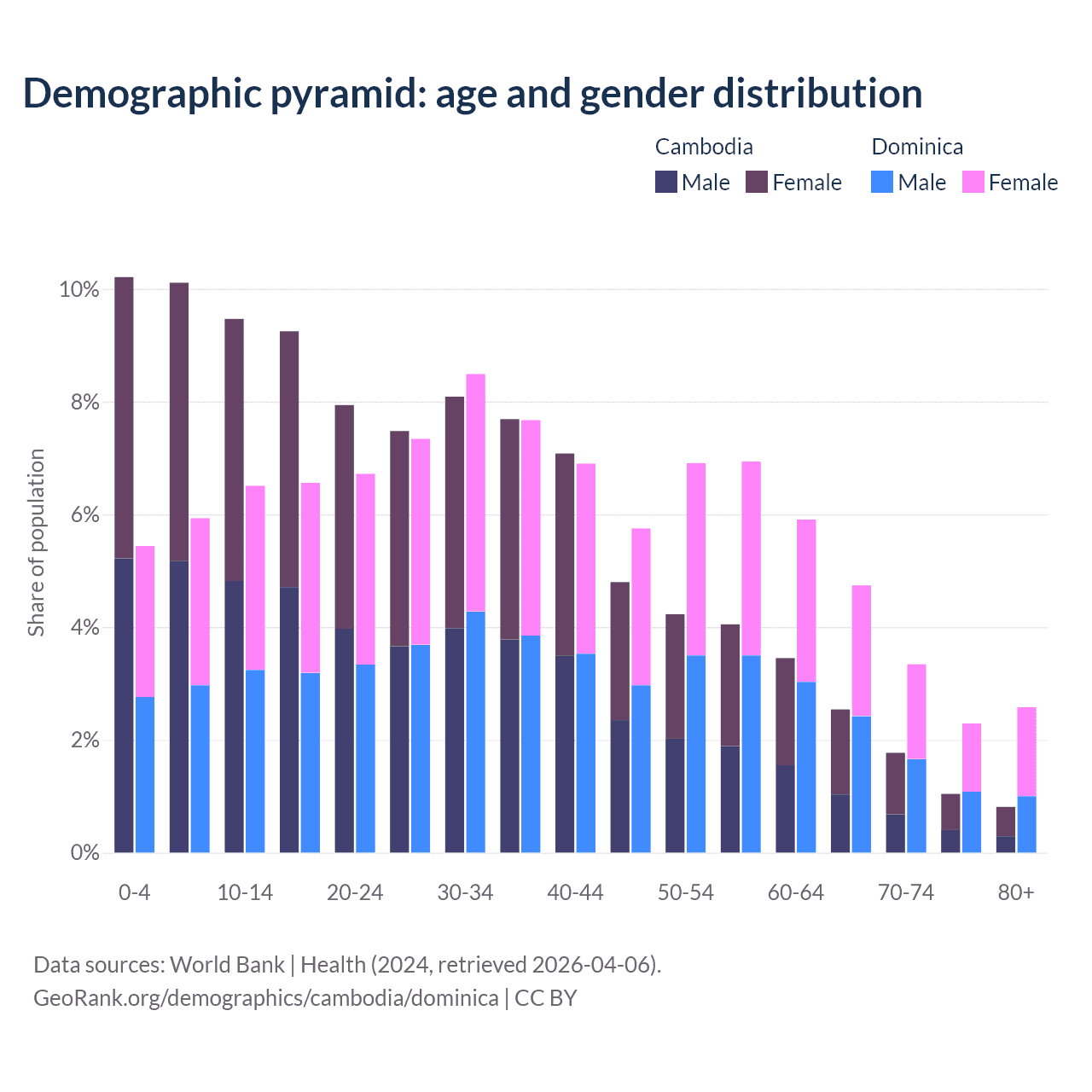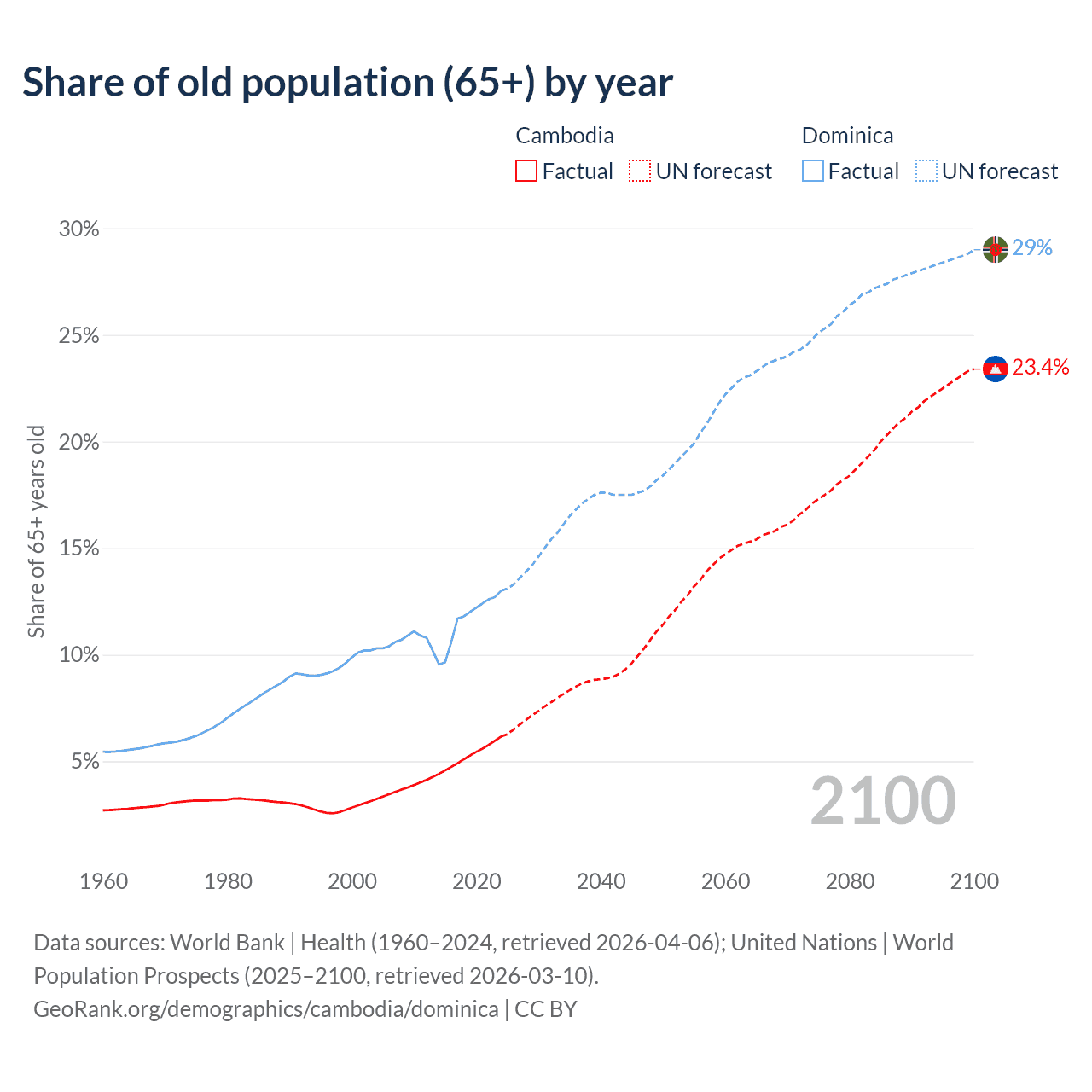 The share of older people aged 65 and over is 6.16% in Cambodia and 13% in Dominica. Life expectancy in Cambodia compared to Dominica .