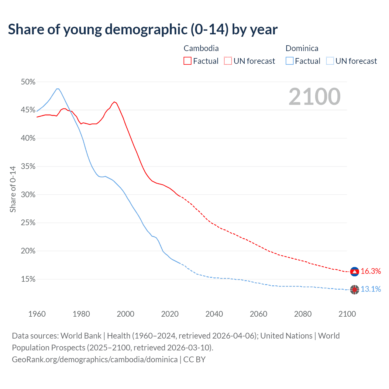 - The share of young demographic (0-15 years old) in Cambodia is 29.8% vs 17.9% in Dominica.