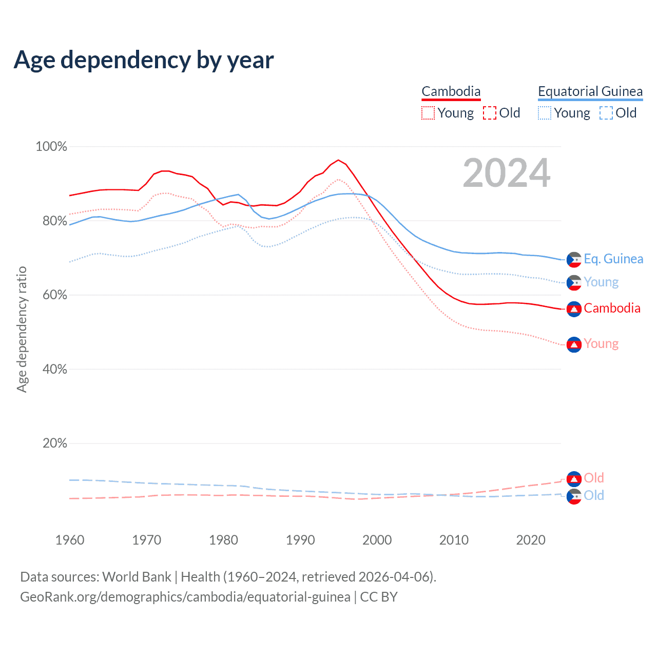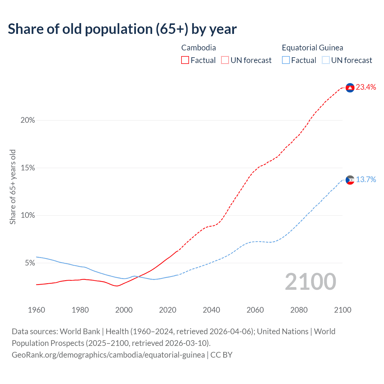 - The share of old-age demographic (65+) in Cambodia is 6.16% vs 3.69% in Equatorial Guinea.
