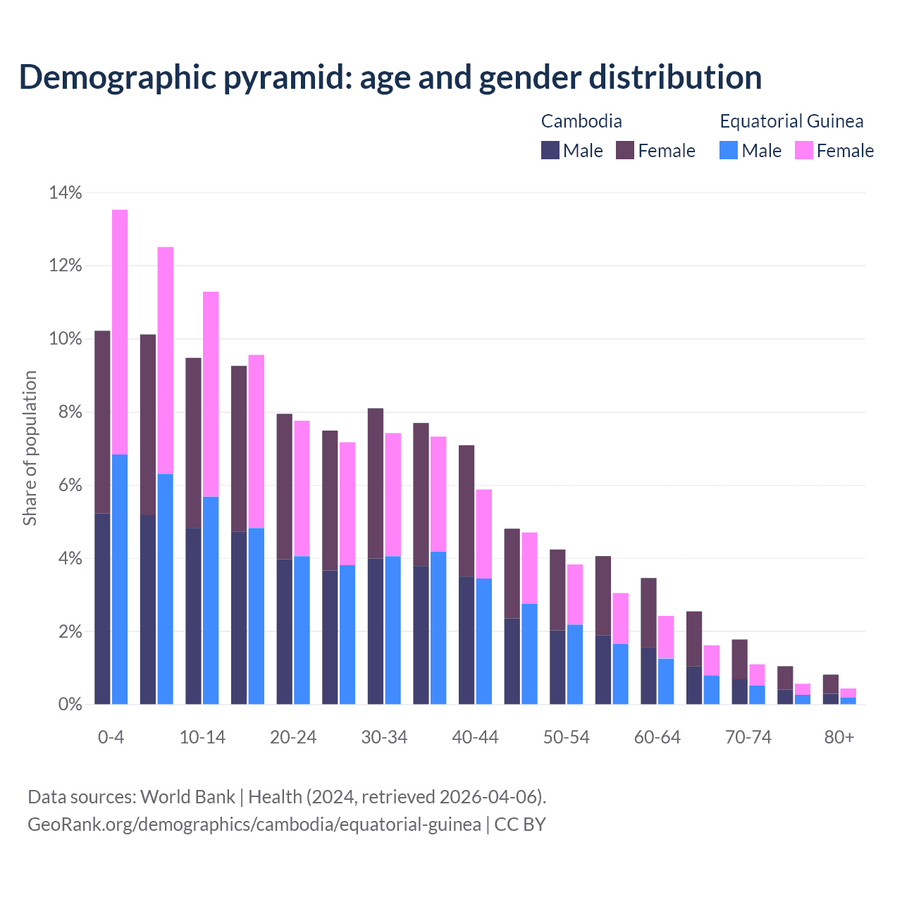 - Cambodia is ranked 121/196 by median age (oldest to youngest) vs 148/196 for Equatorial Guinea.