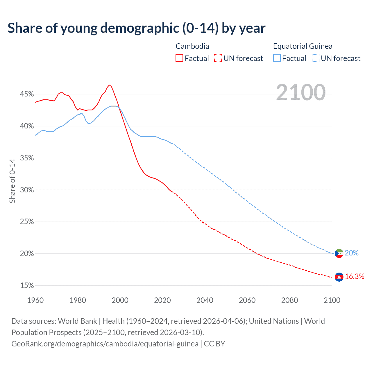 - The share of young demographic (0-15 years old) in Cambodia is 29.8% vs 37.3% in Equatorial Guinea.