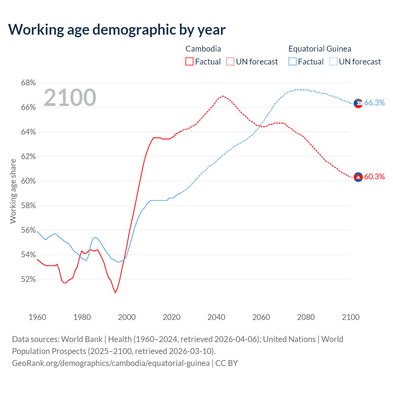 - Cambodia has 11.6M working age adults (aged 15-64) vs 1.18M in Equatorial Guinea.