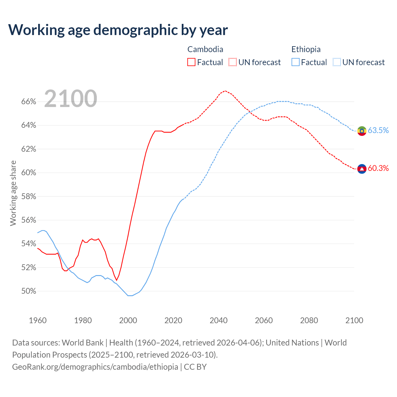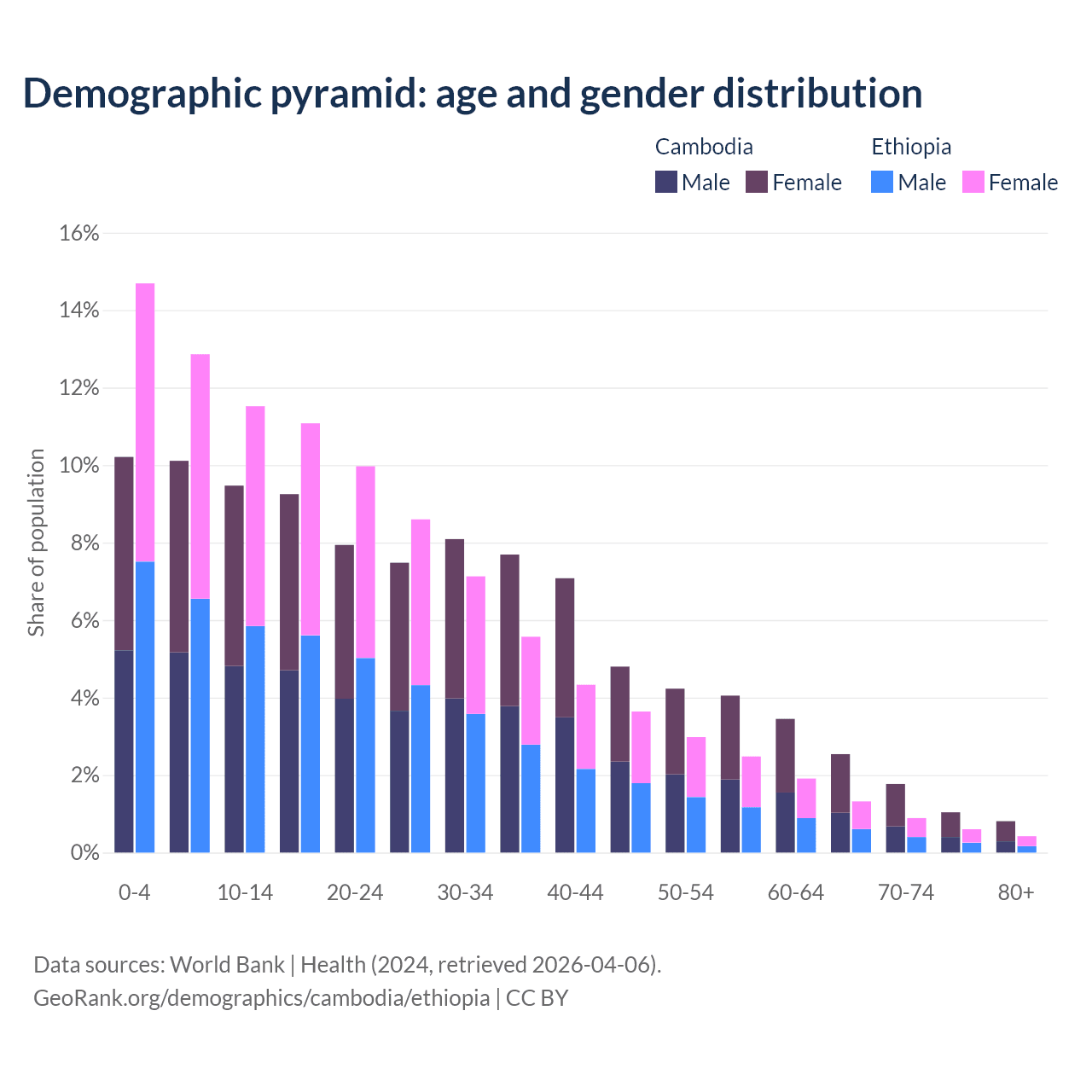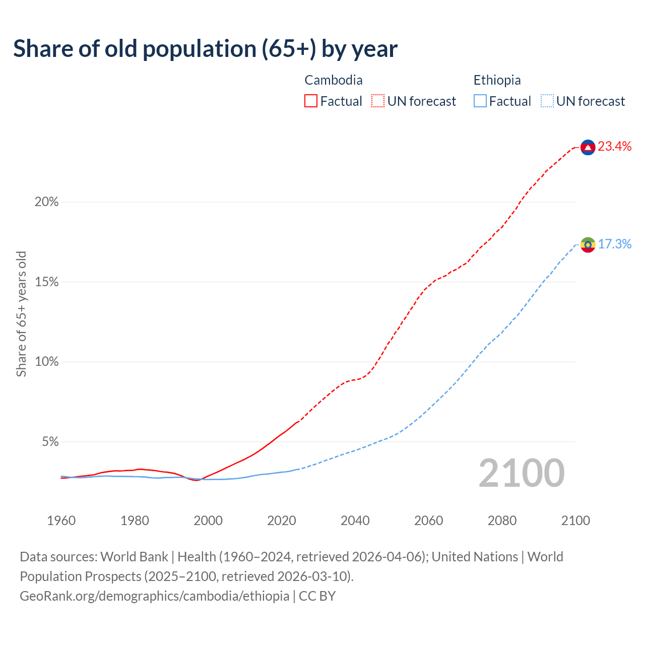 The share of older people aged 65 and over is 6.16% in Cambodia and 3.23% in Ethiopia. Life expectancy in Cambodia compared to Ethiopia .