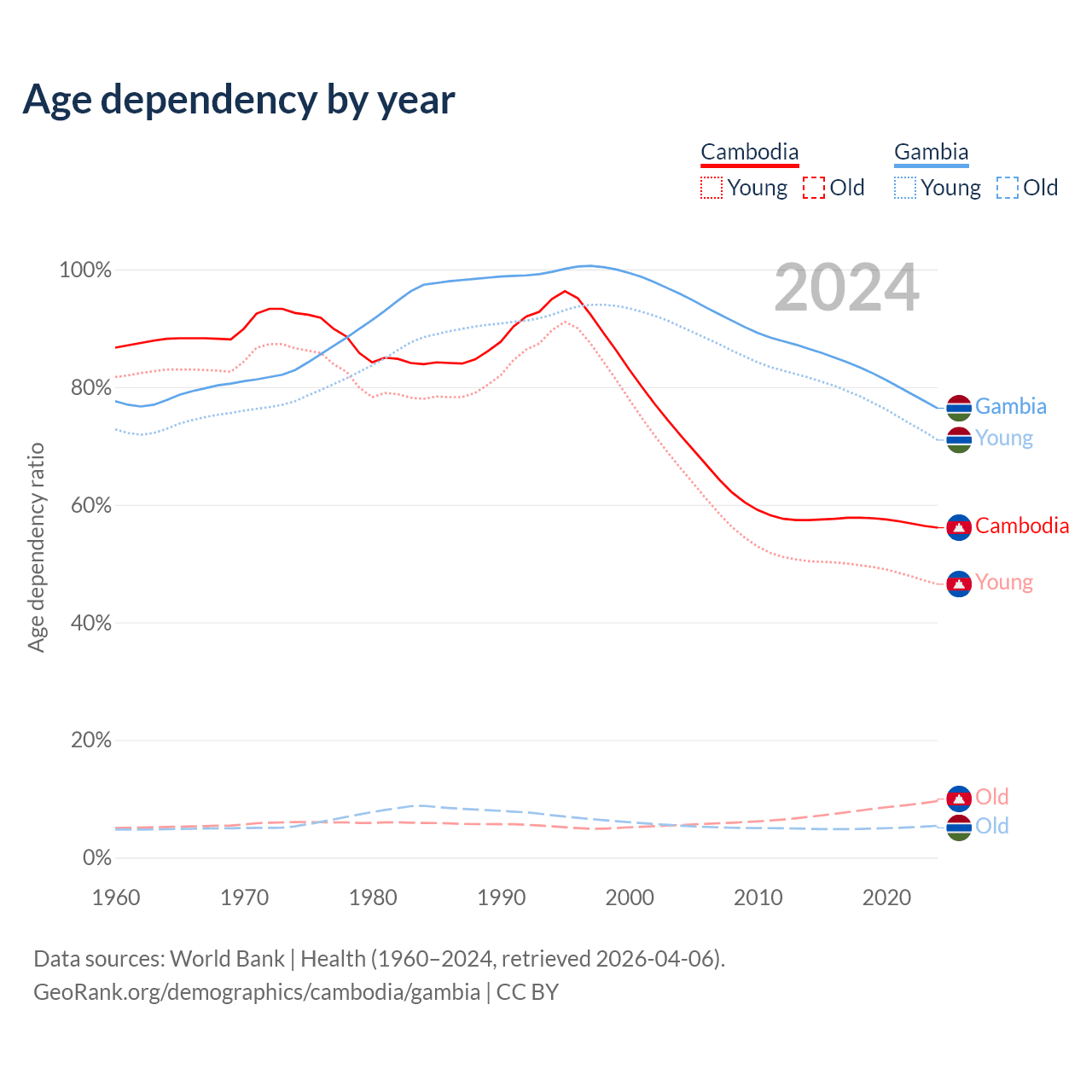 - The share of old-age demographic (65+) in Cambodia is 6.16% vs 3.08% in the Gambia.