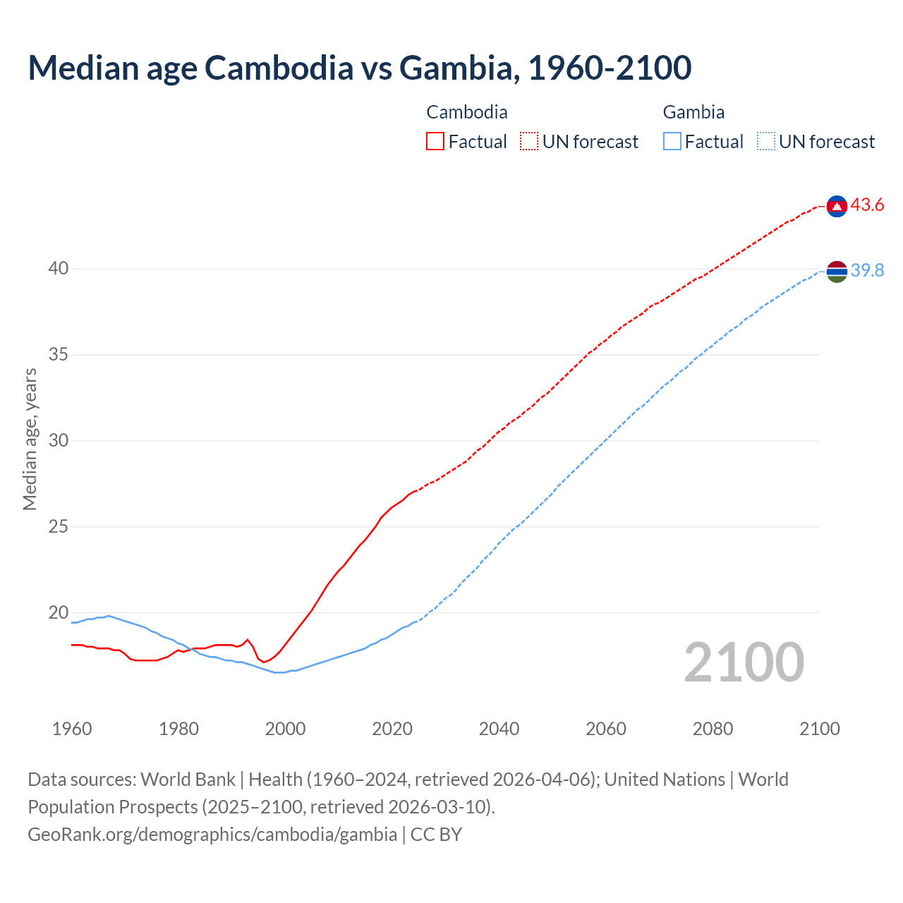 - Cambodia is ranked 121/196 by median age (oldest to youngest) vs 171/196 for the Gambia.