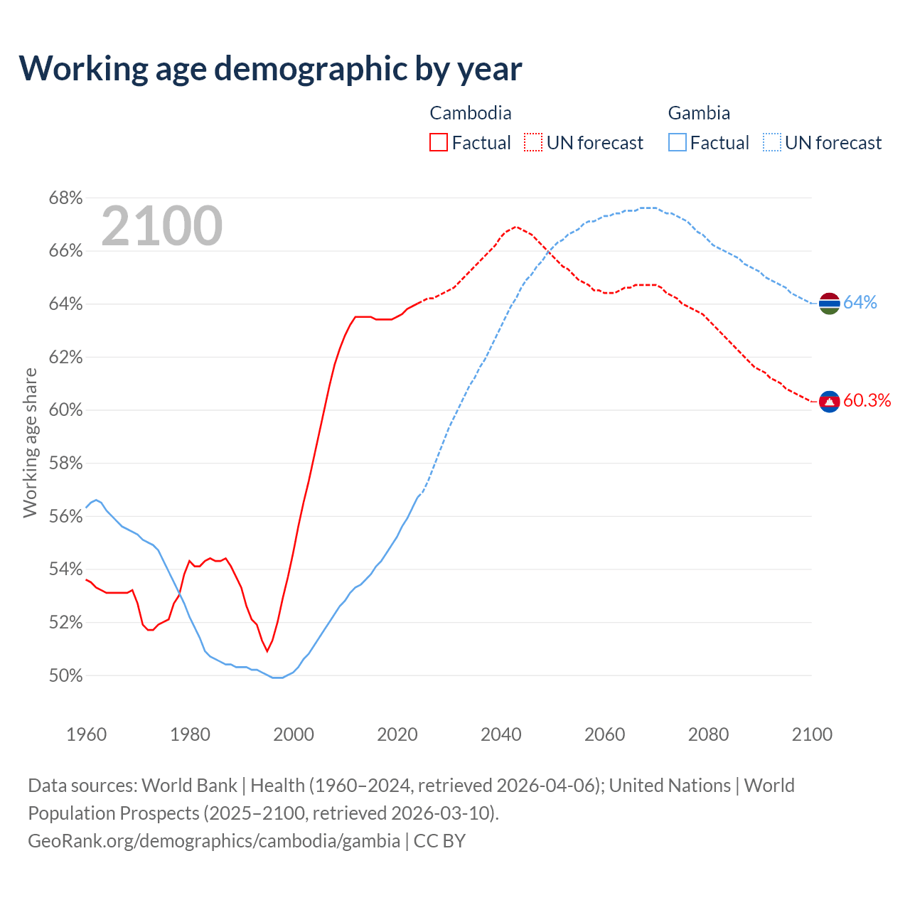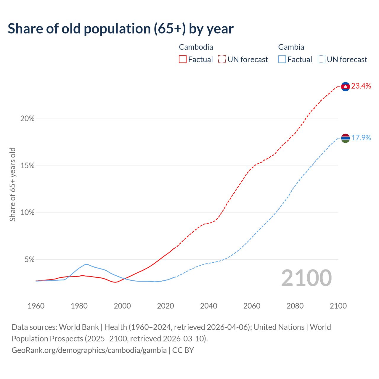 The share of older people aged 65 and over is 6.16% in Cambodia and 3.08% in the Gambia. Life expectancy in Cambodia compared to the Gambia .