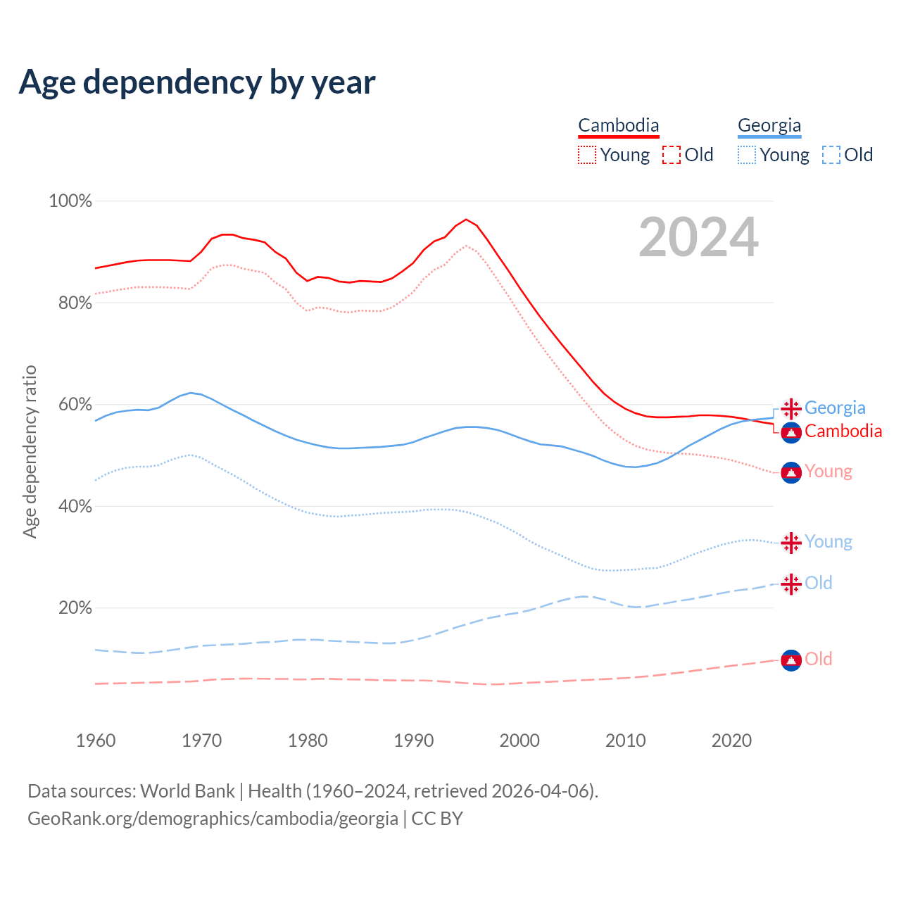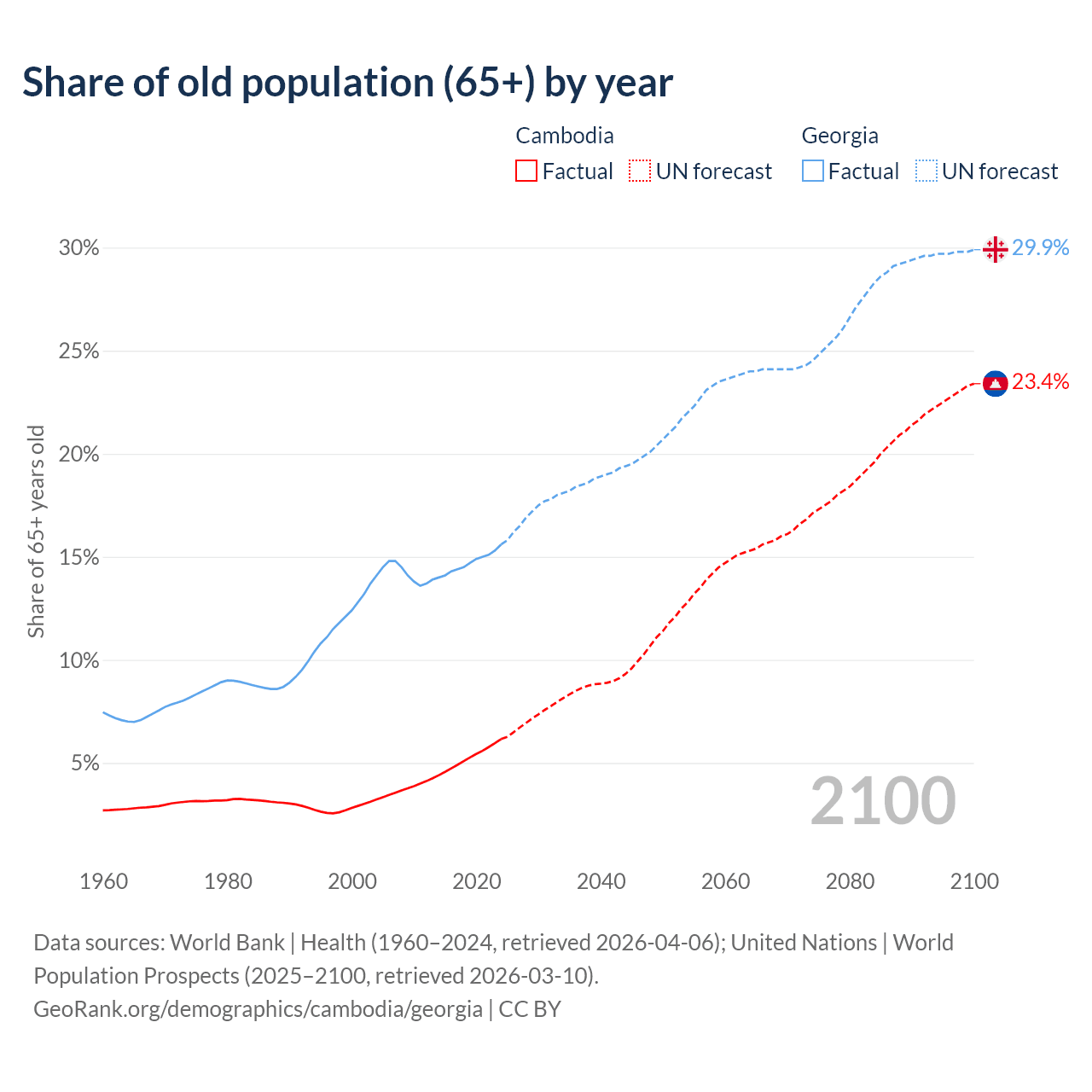 The share of older people aged 65 and over is 6.16% in Cambodia and 15.6% in Georgia. Life expectancy in Cambodia compared to Georgia .