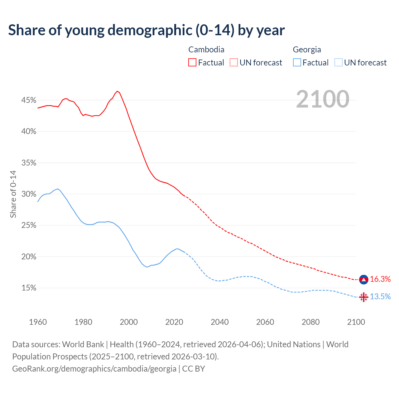 - The share of young demographic (0-15 years old) in Cambodia is 29.8% vs 20.8% in Georgia.