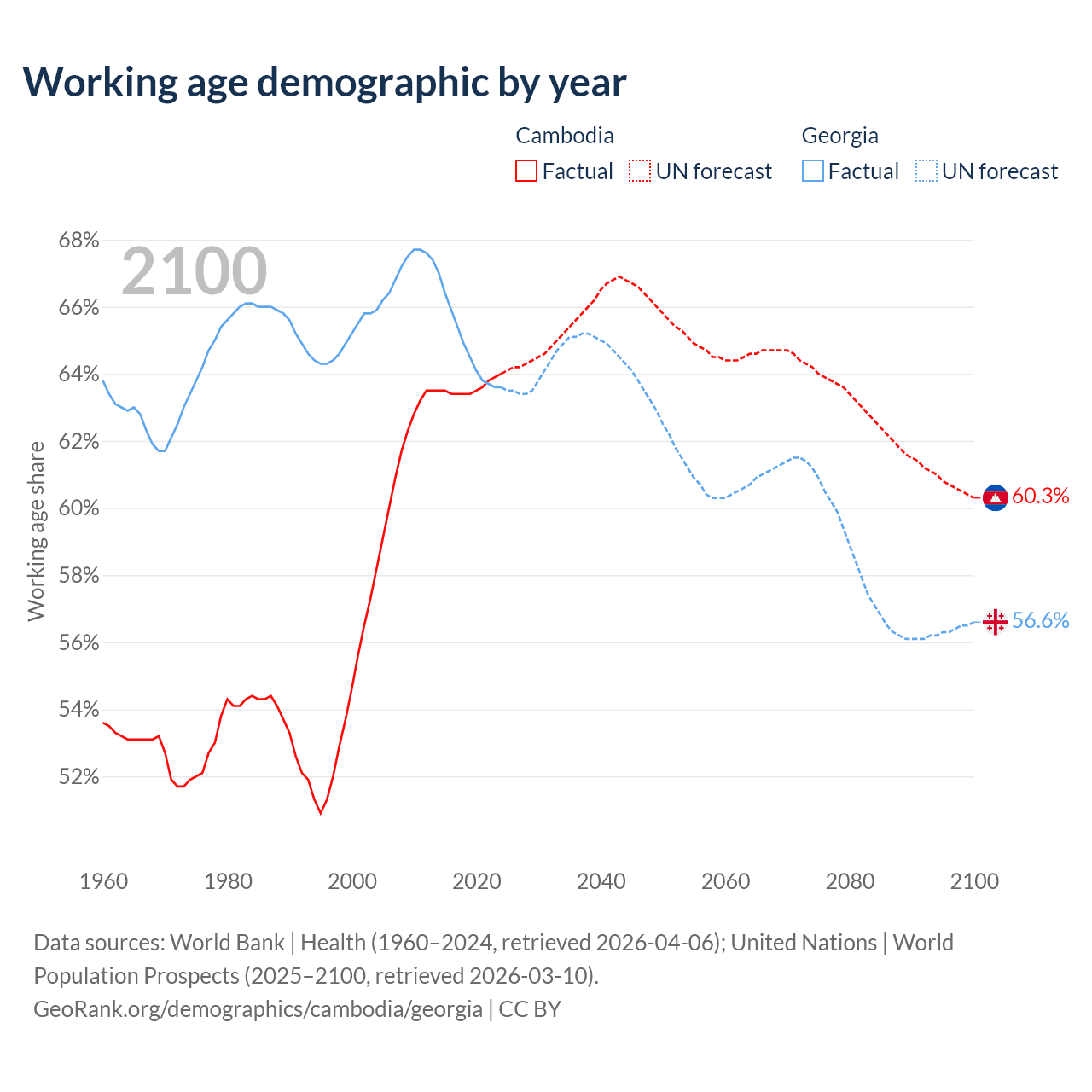 - Cambodia has 11.6M working age adults (aged 15-64) vs 2.35M in Georgia.