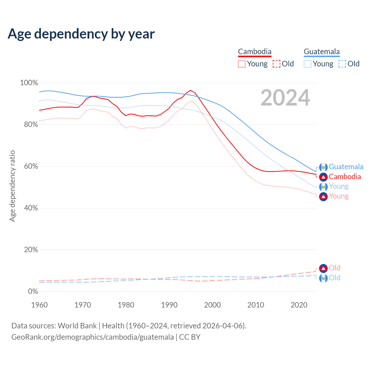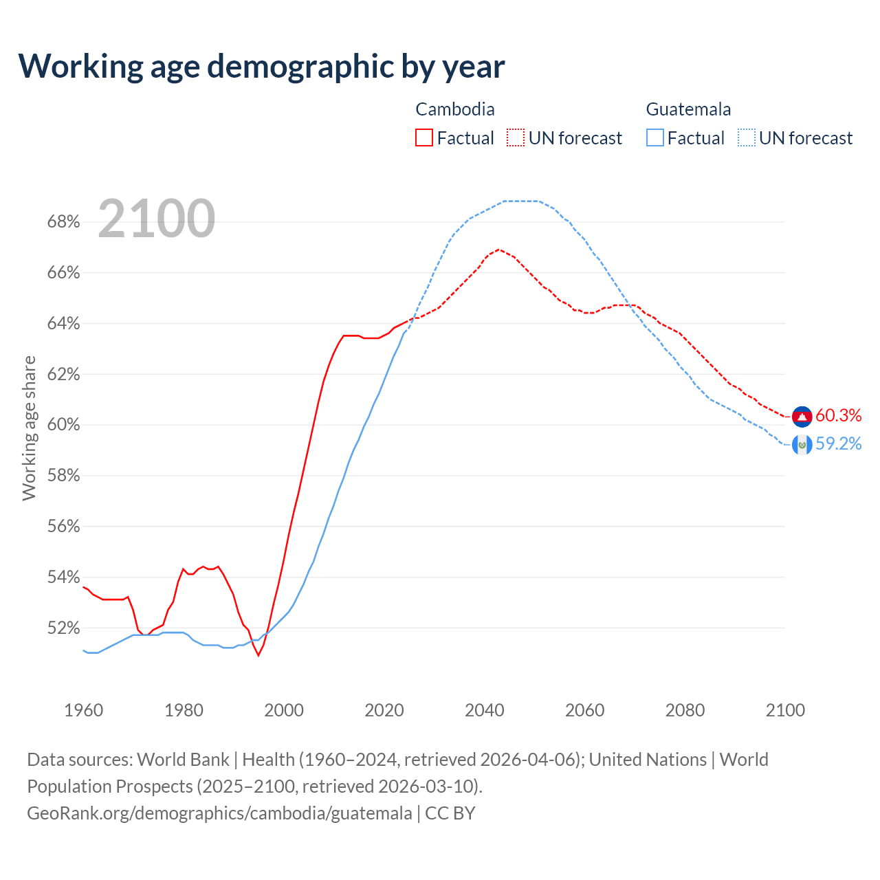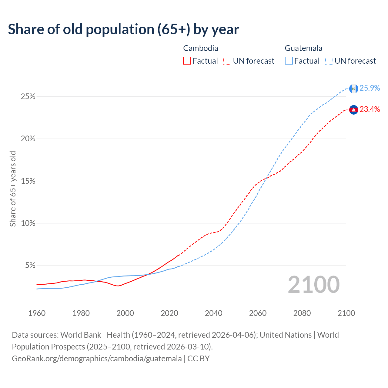 The share of older people aged 65 and over is 6.16% in Cambodia and 4.85% in Guatemala. Life expectancy in Cambodia compared to Guatemala .