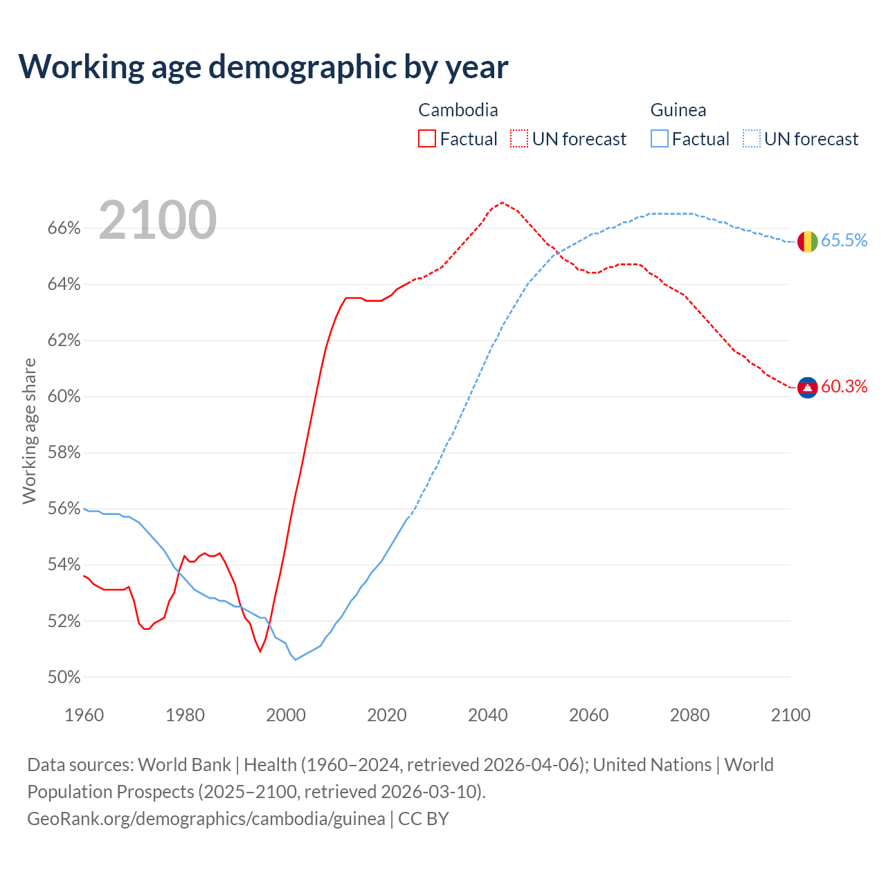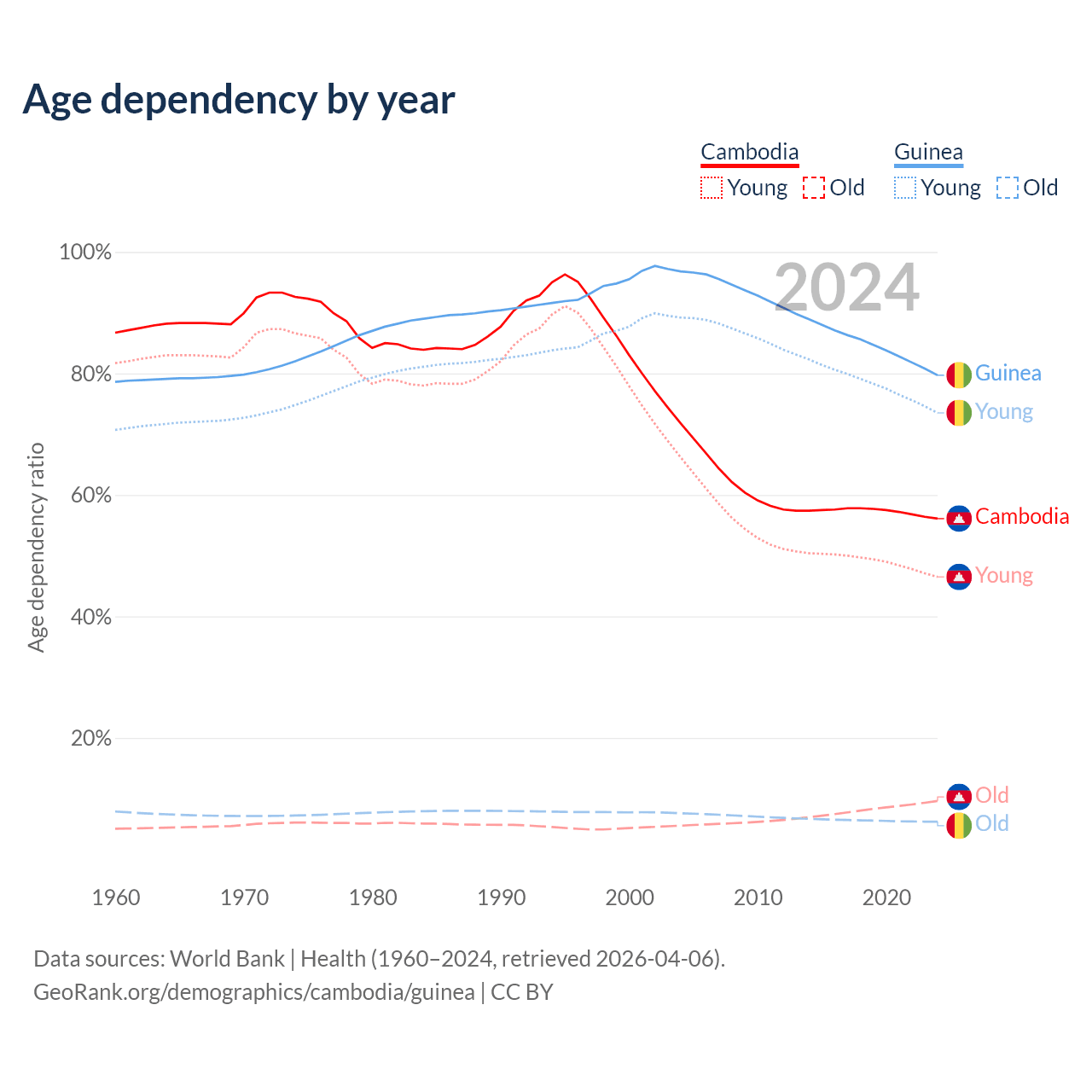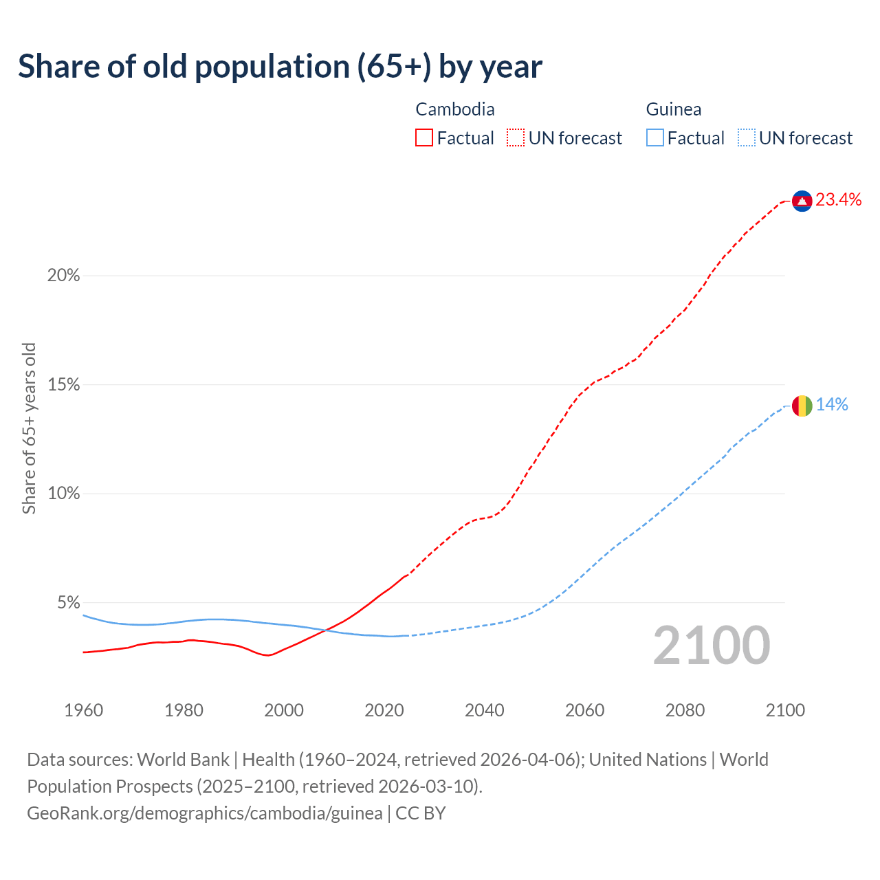 The share of older people aged 65 and over is 6.16% in Cambodia and 3.46% in Guinea. Life expectancy in Cambodia compared to Guinea .