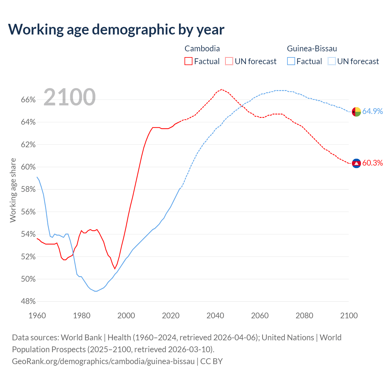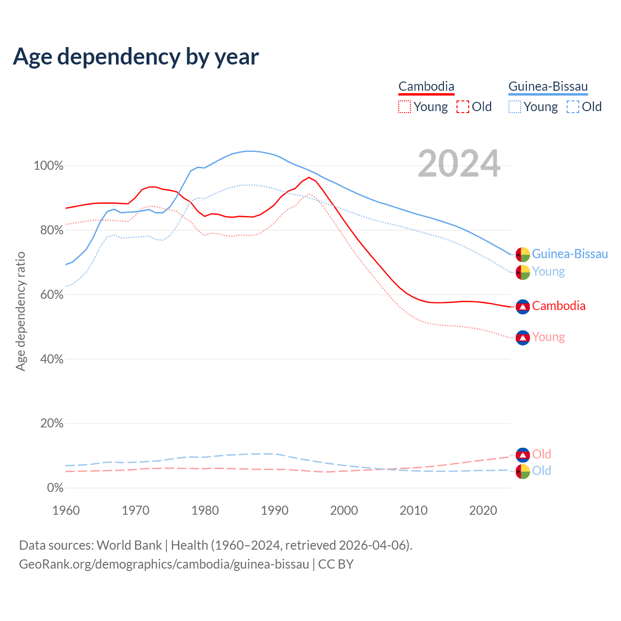 - The share of old-age demographic (65+) in Cambodia is 6.16% vs 3.19% in Guinea-Bissau.