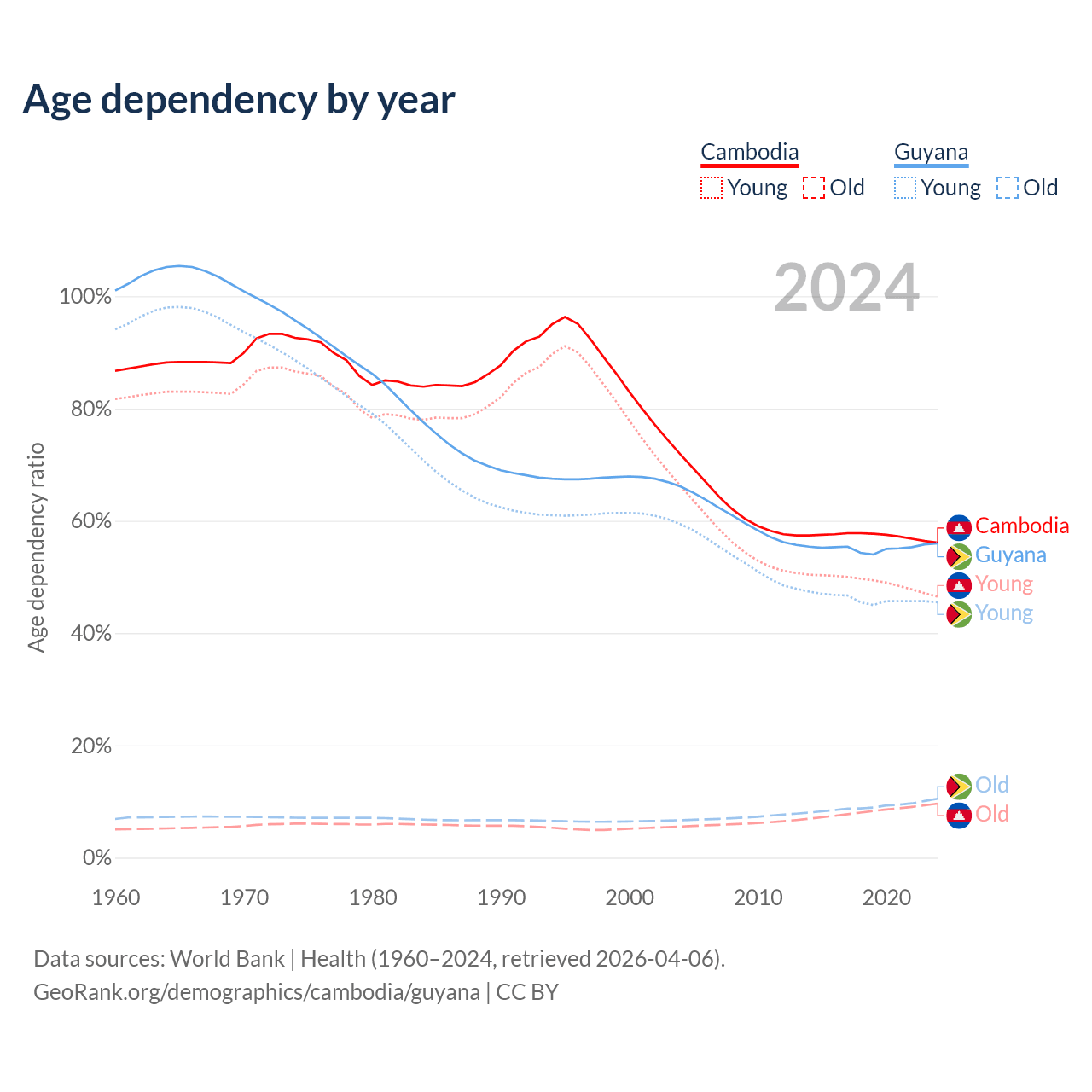 - The share of old-age demographic (65+) in Cambodia is 6.16% vs 6.73% in Guyana.