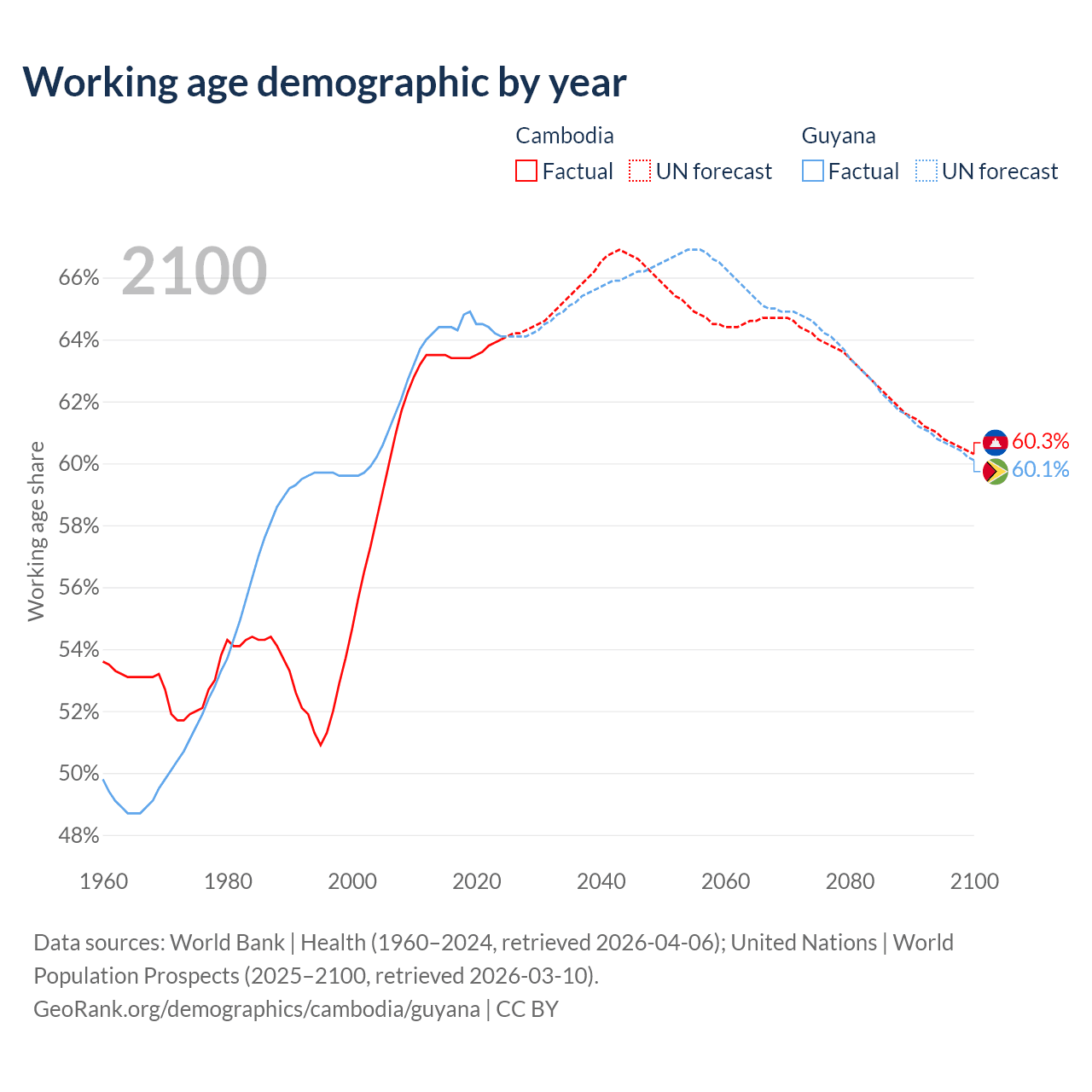 - Cambodia has 11.6M working age adults (aged 15-64) vs 540K in Guyana.