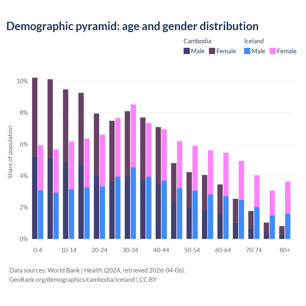 - As of 2026, the population of Cambodia is 18.1M vs 397K in Iceland - 45.6 times difference.