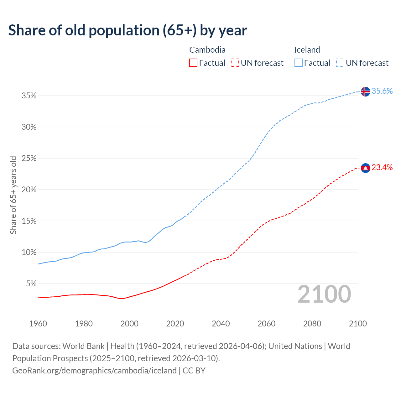 The share of older people aged 65 and over is 6.16% in Cambodia and 15.6% in Iceland. Life expectancy in Cambodia compared to Iceland .